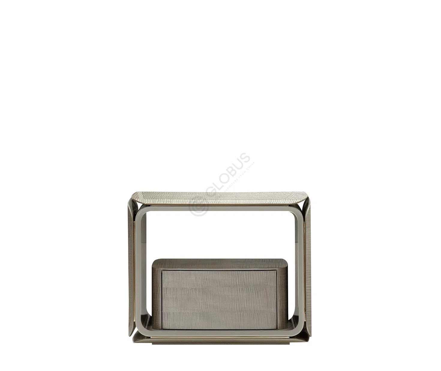Конструкция выполнена с использованием комбинации высококачественных материалов: натурального дерева, прочного металла, фанеры и ценного шпона. Глубокий темный оттенок корпуса придает изысканность, а уникальный рисунок древесного шпона на одном из торцов становится эффектным визуальным акцентом. Металлическая основа обеспечивает устойчивость и дополняет элегантную эстетику.