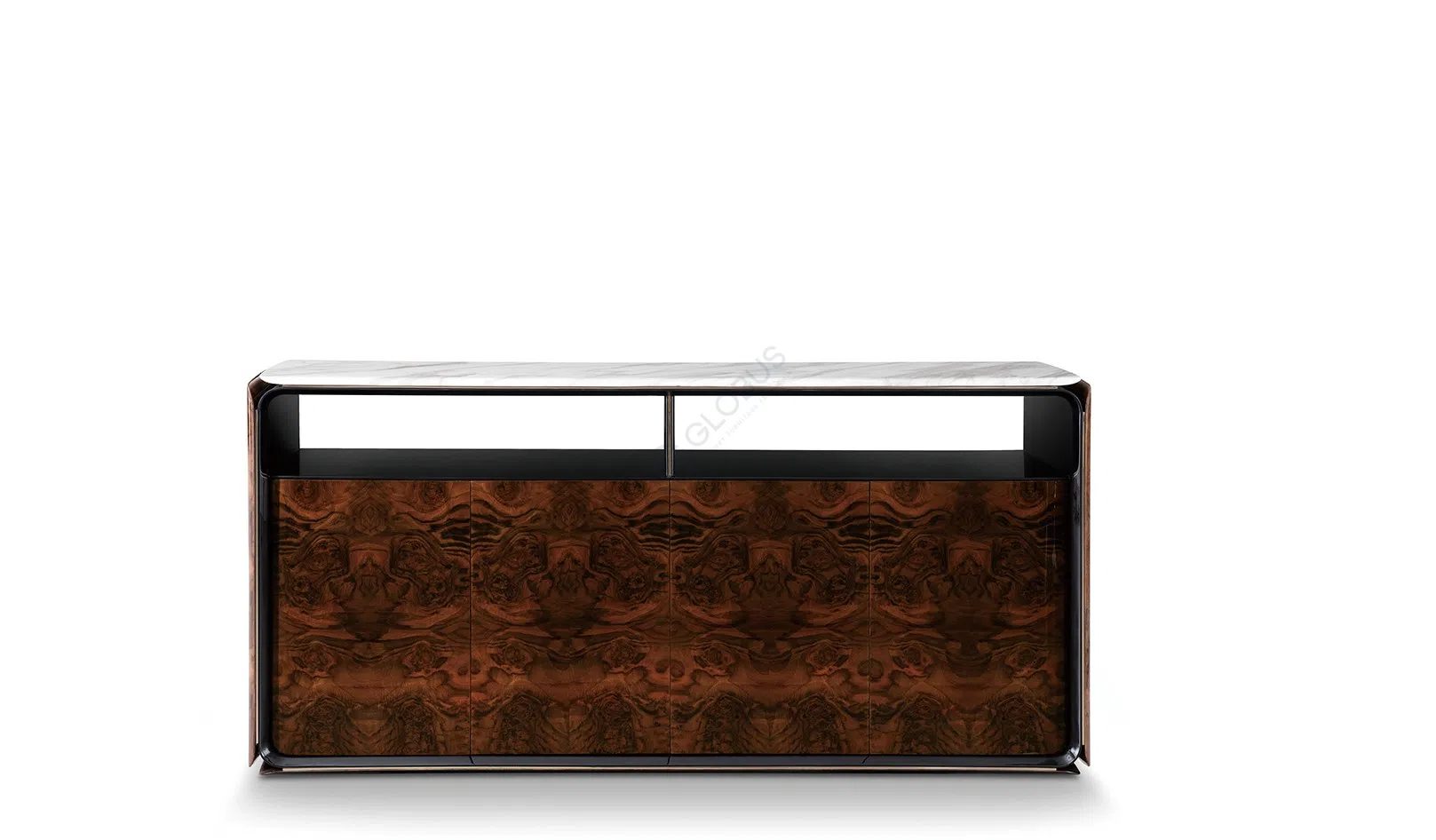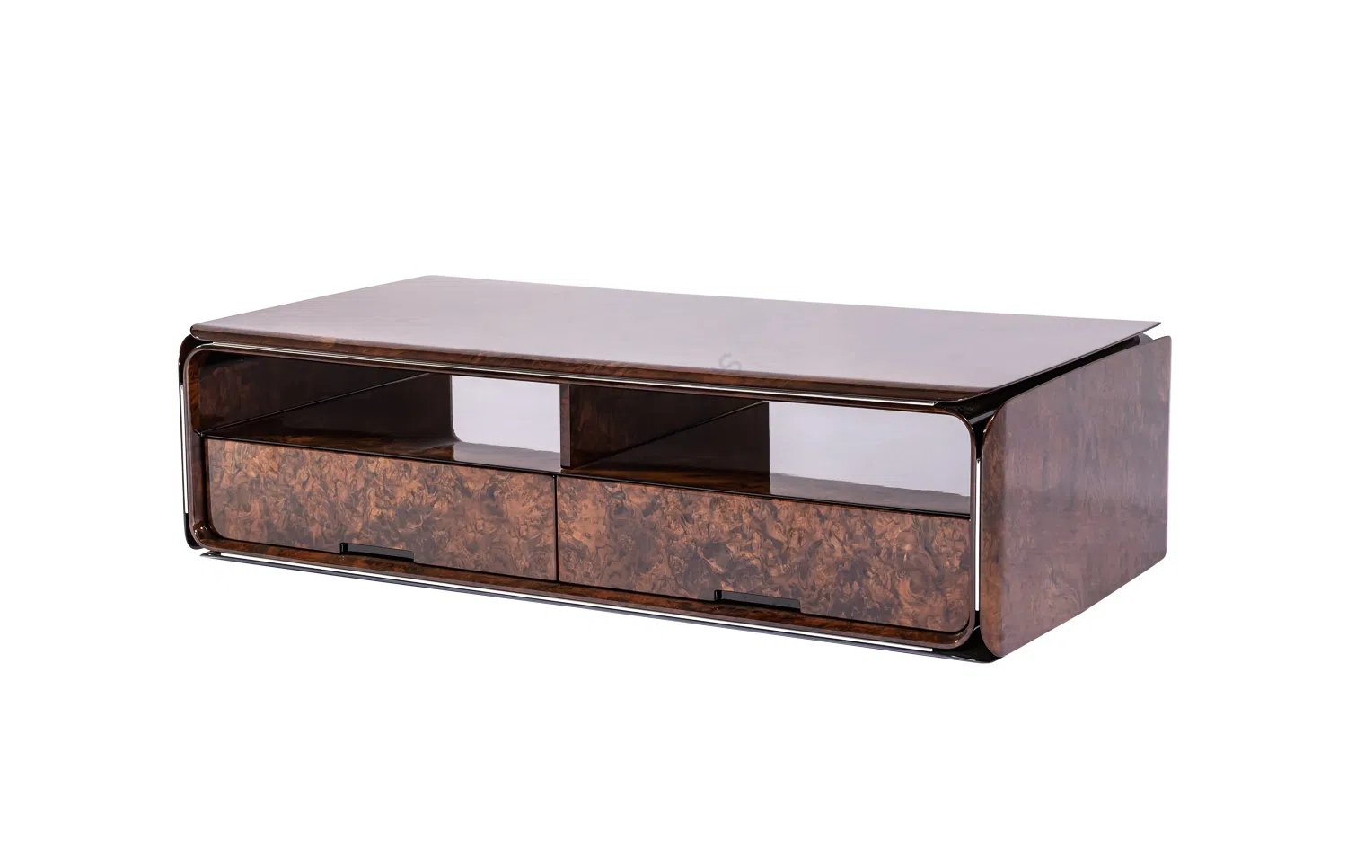 Этот предмет мебели для гостиной или спальни представляет собой выразительный элемент актуального интерьера. Его удлиненный силуэт с плавными изогнутыми линиями создает ощущение легкости и динамики в пространстве. Общий вид изделия основан на гармоничном контрасте между глянцевой поверхностью основного корпуса и теплой, живой текстурой дерева.