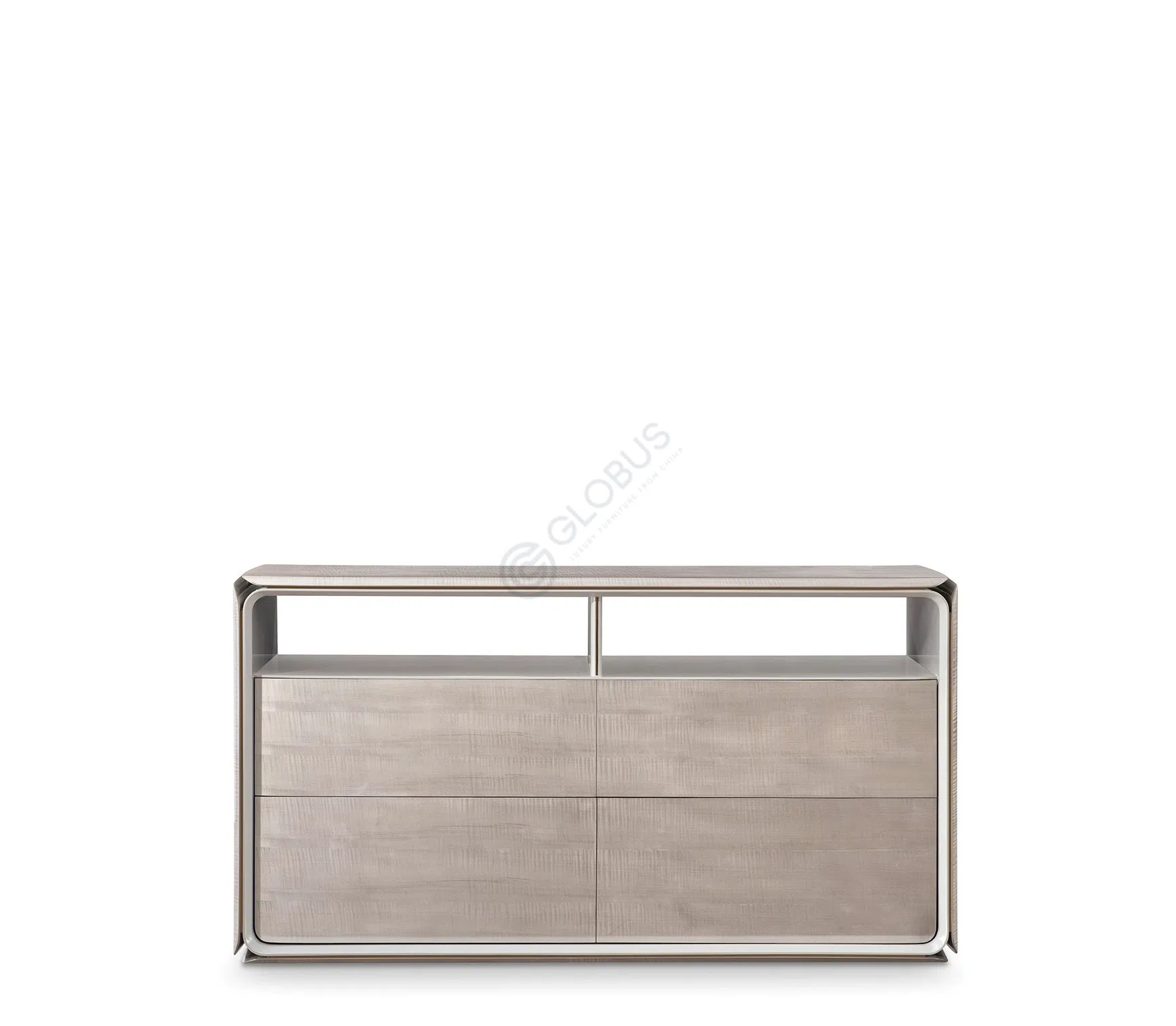 В центральной части предусмотрена удобная функциональная зона с прозрачными дверцами, идеально подходящая для размещения медиатехники или декоративных предметов. Внутренние стеклянные полки добавляют воздушности и служат практичным решением для организации хранения. Это изделие не просто подставка, а самостоятельный арт-объект, способный преобразить атмосферу комнаты, гармонично вписываясь как в парадную гостиную, так и в приватную спальню.