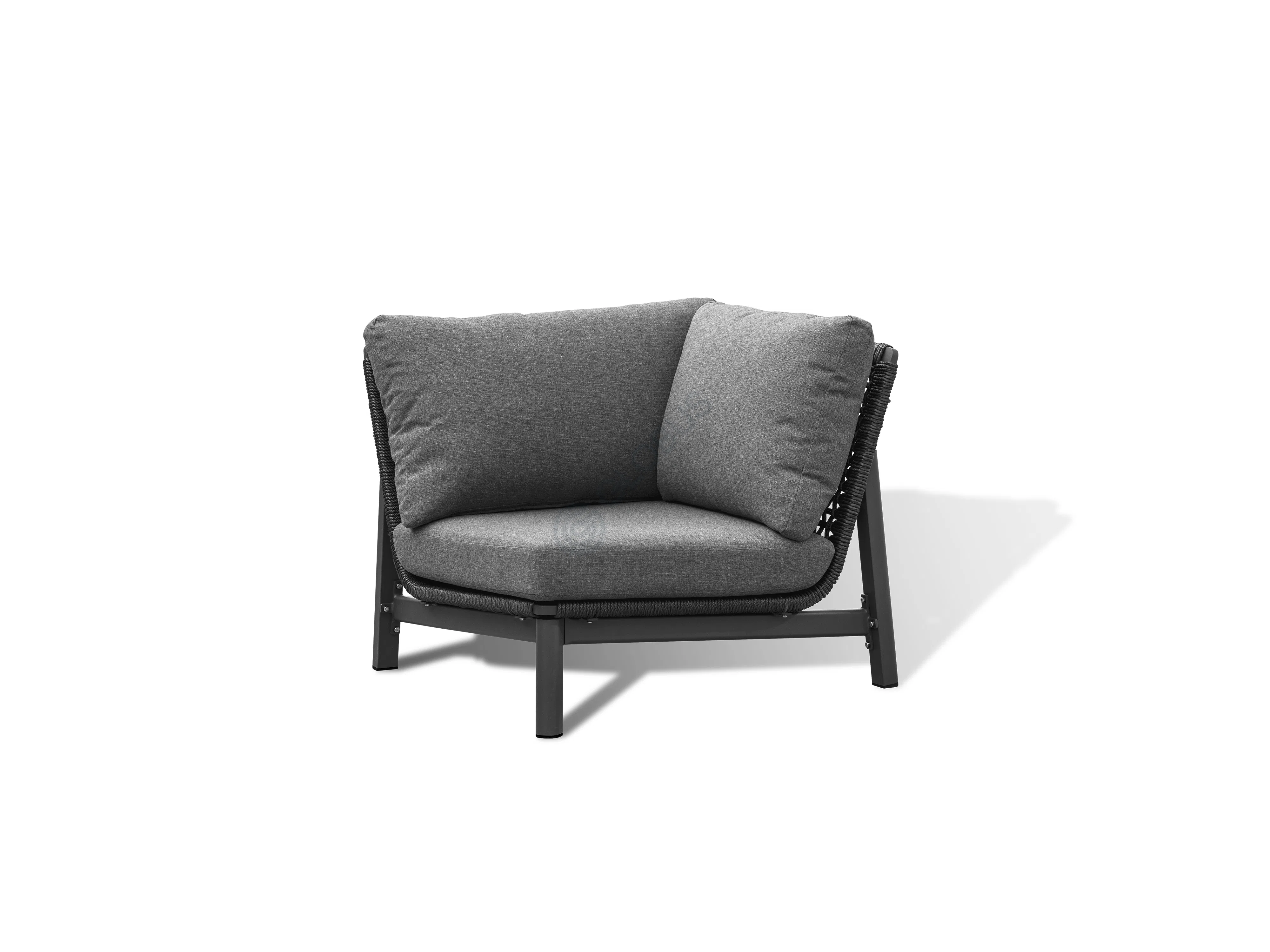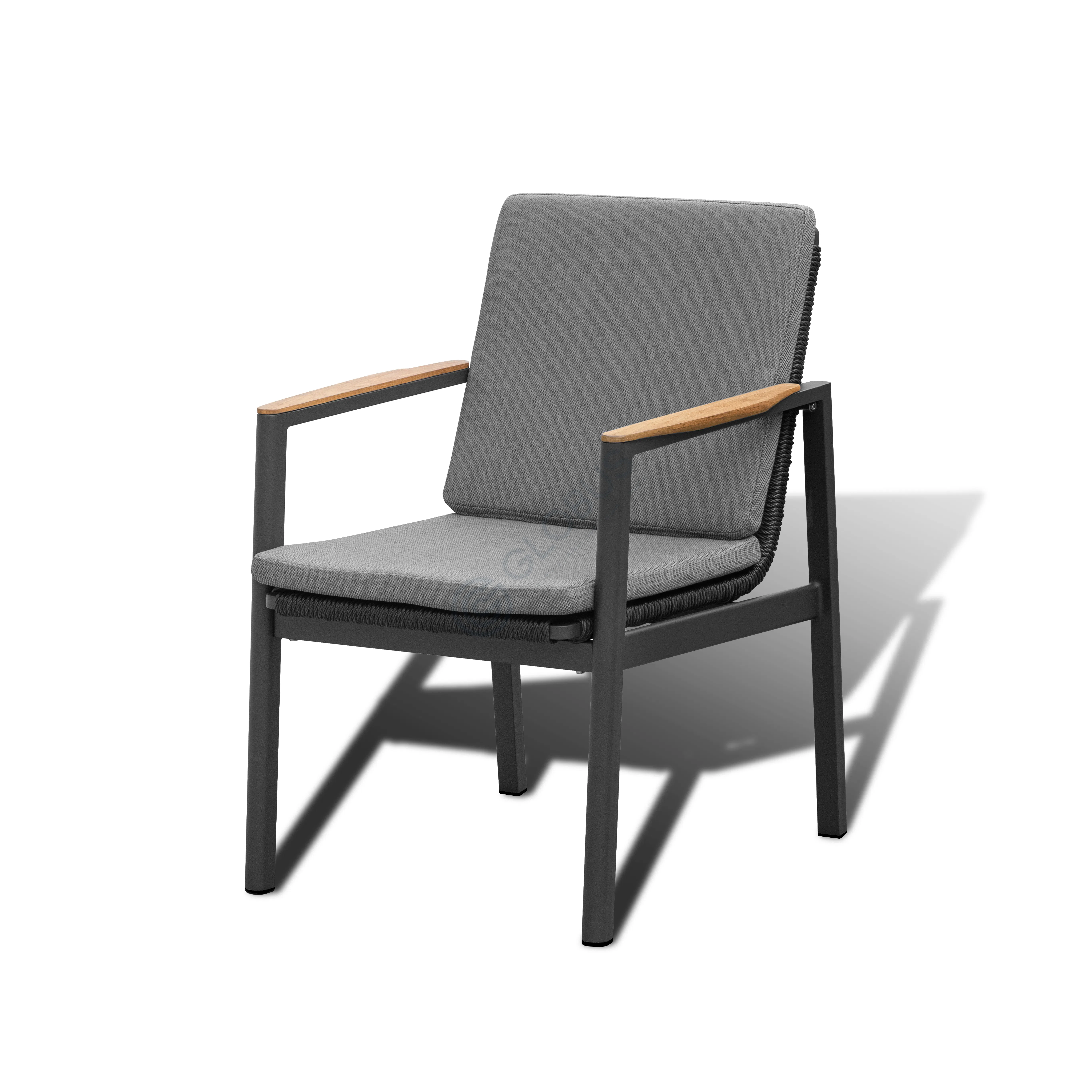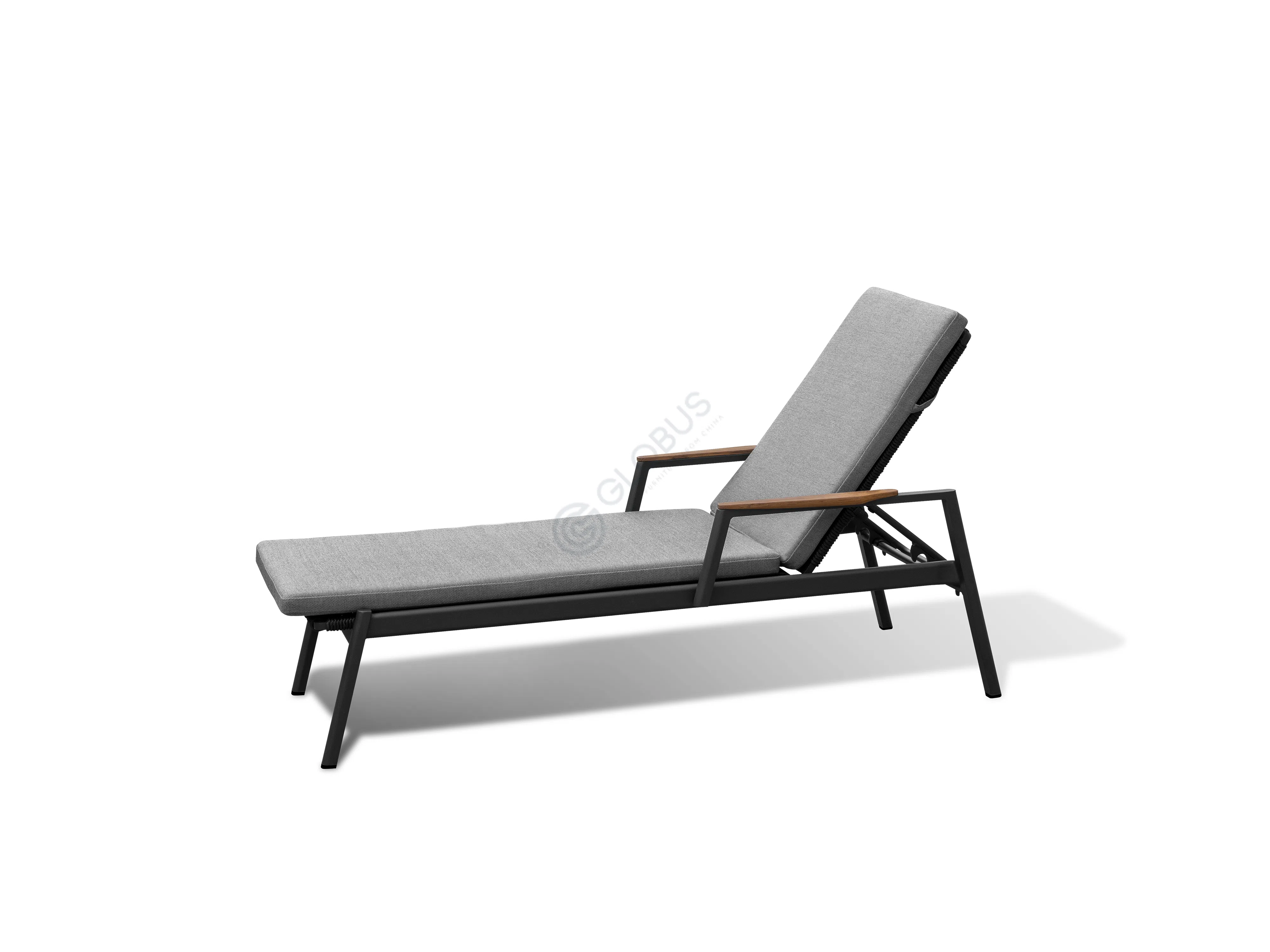 Его прочная основа из высококачественного алюминия гарантирует долговечность и устойчивость к внешним условиям. Под мягкой текстильной подушкой расположен изящный элемент из искусственного ротанга, добавляющий интересную текстуру и подчеркивающий премиальное качество исполнения.