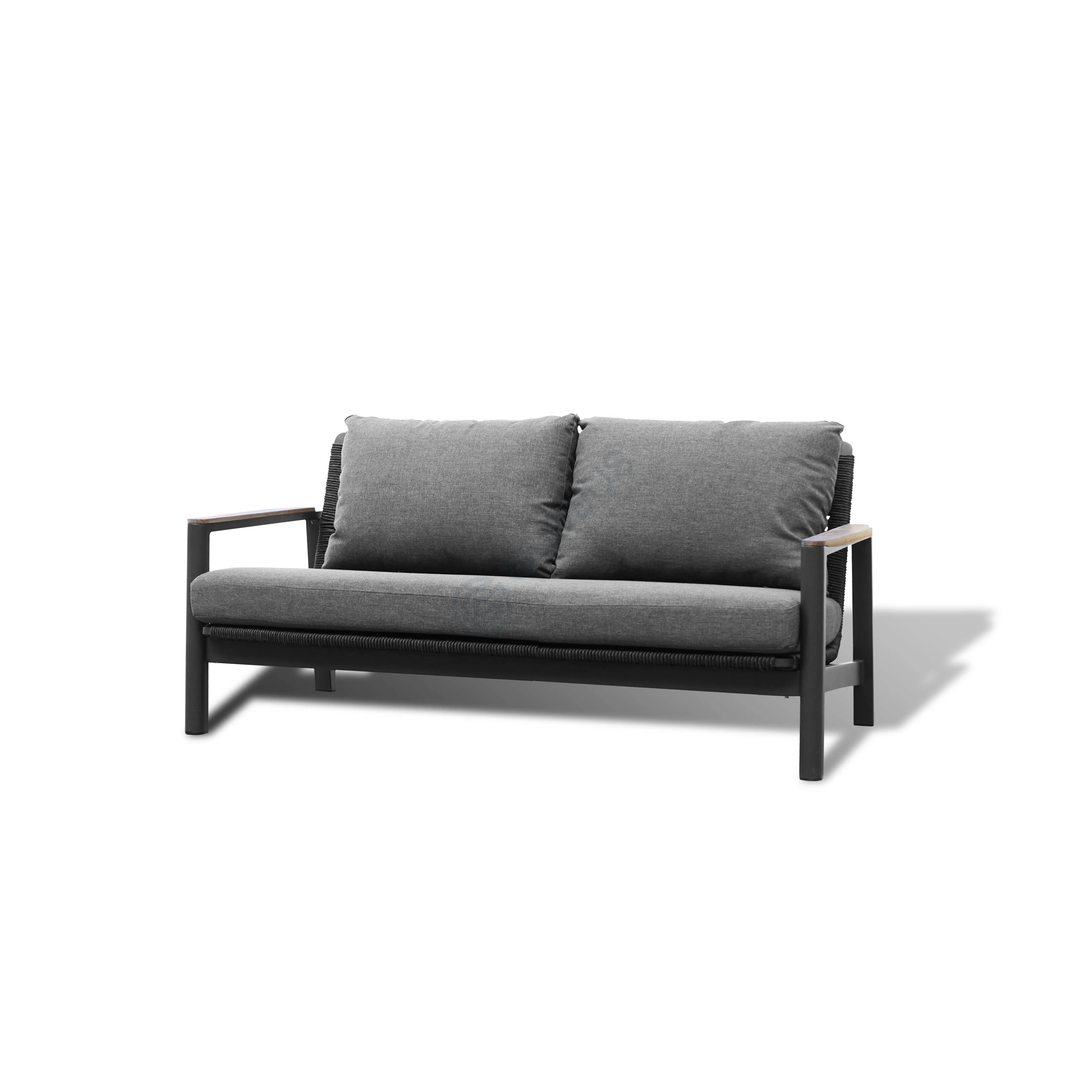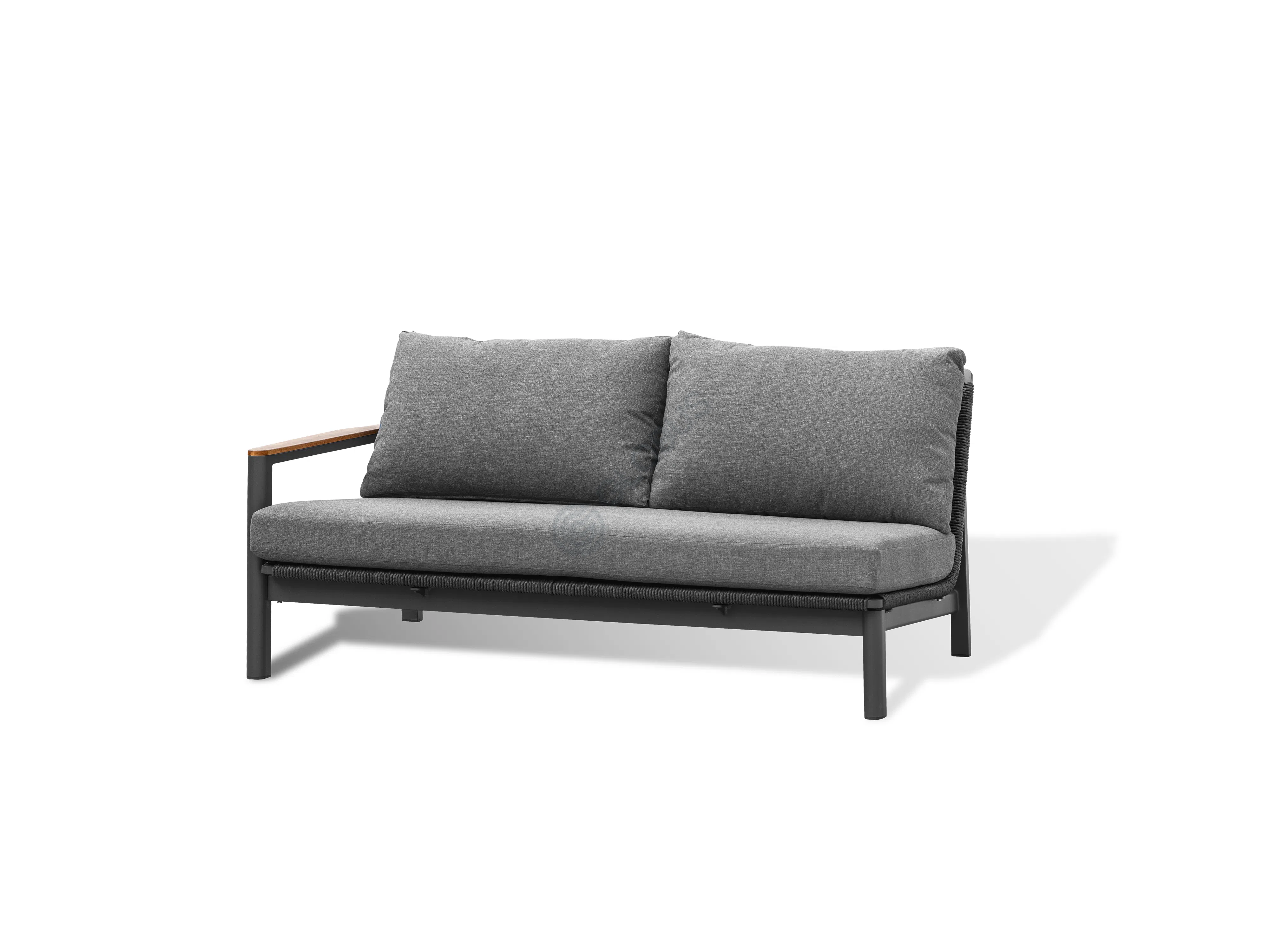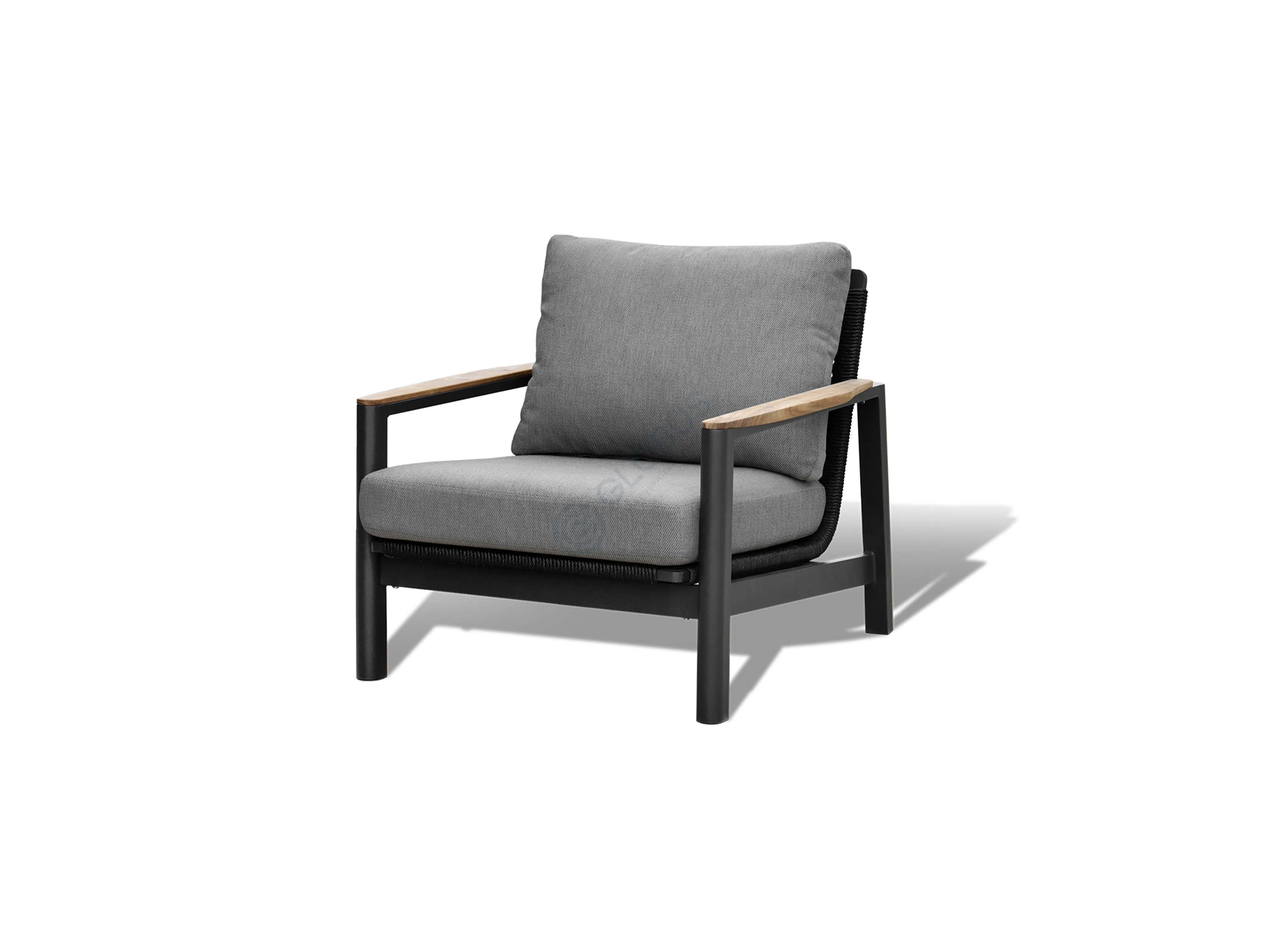 Его прочная основа из высококачественного алюминия гарантирует долговечность и устойчивость к внешним условиям. Под мягкой текстильной подушкой расположен изящный элемент из искусственного ротанга, добавляющий интересную текстуру и подчеркивающий премиальное качество исполнения.