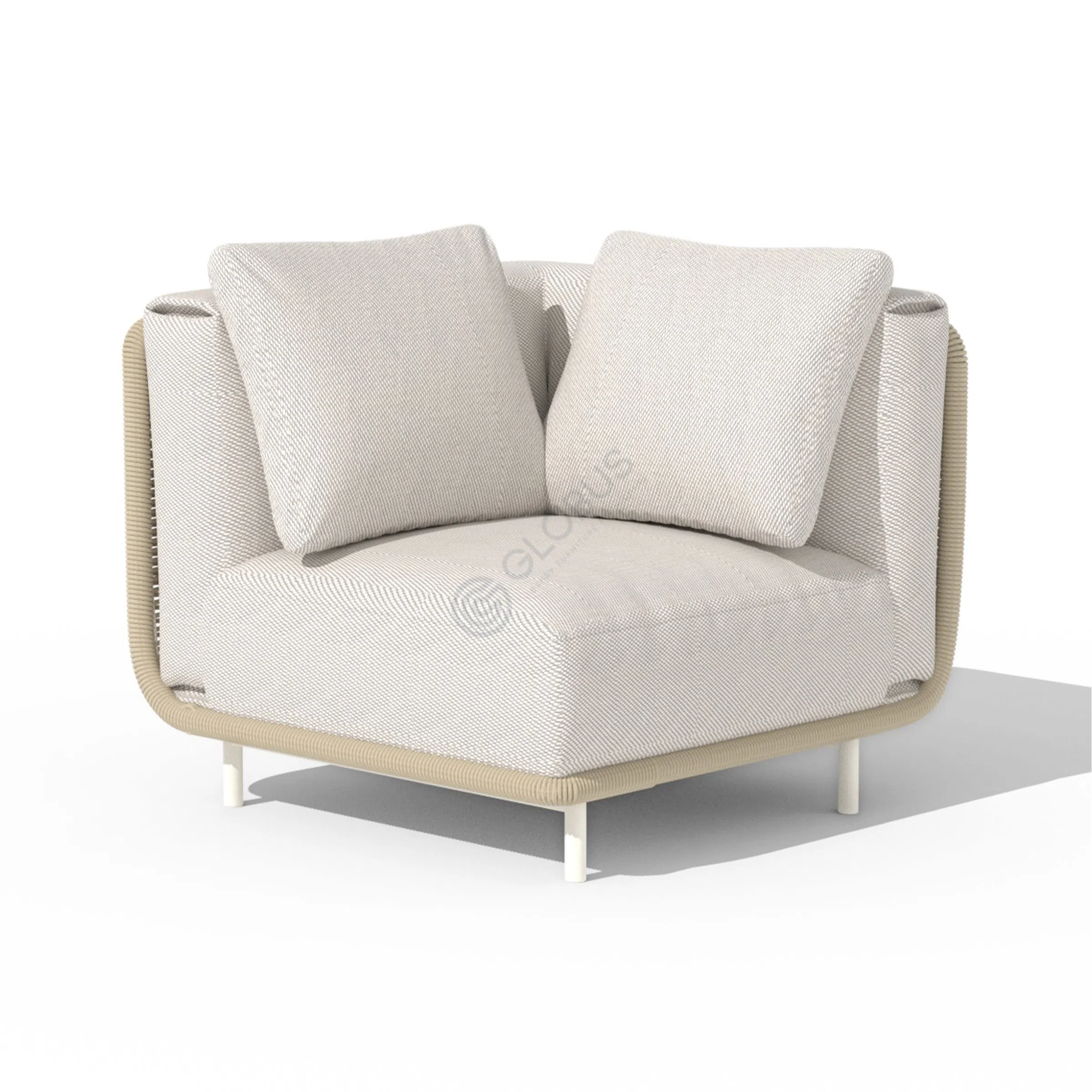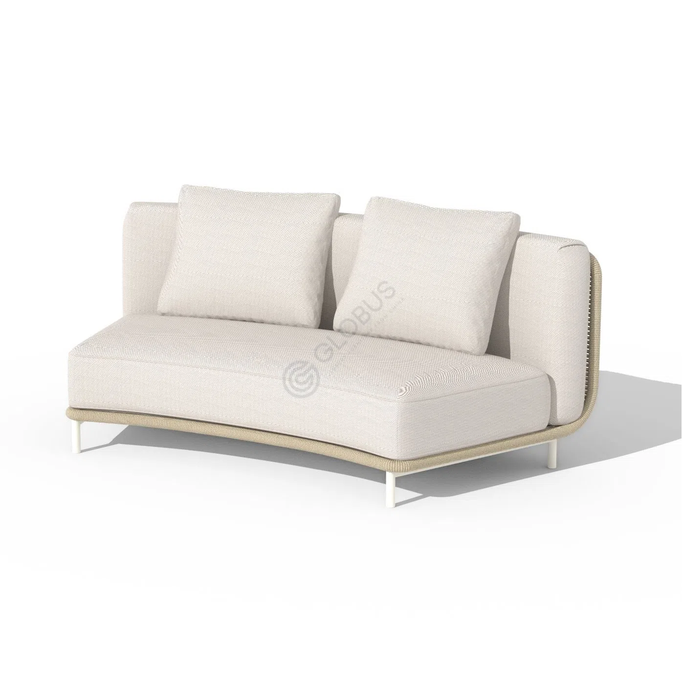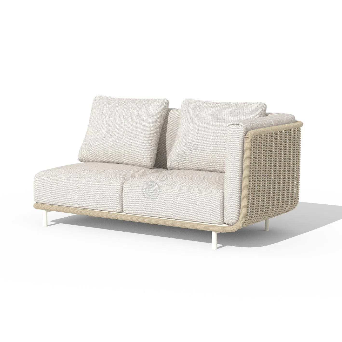 Каркас изделия выполнен из прочного алюминия, обеспечивающего надежную основу. Мягкое сиденье и спинка обтянуты приятным на ощупь текстилем, приглашая расположиться с максимальным удобством. Особую выразительность придает боковая панель, искусно сплетенная из искусственного ротанга, добавляющая фактурный акцент и визуальную теплоту дизайну.
