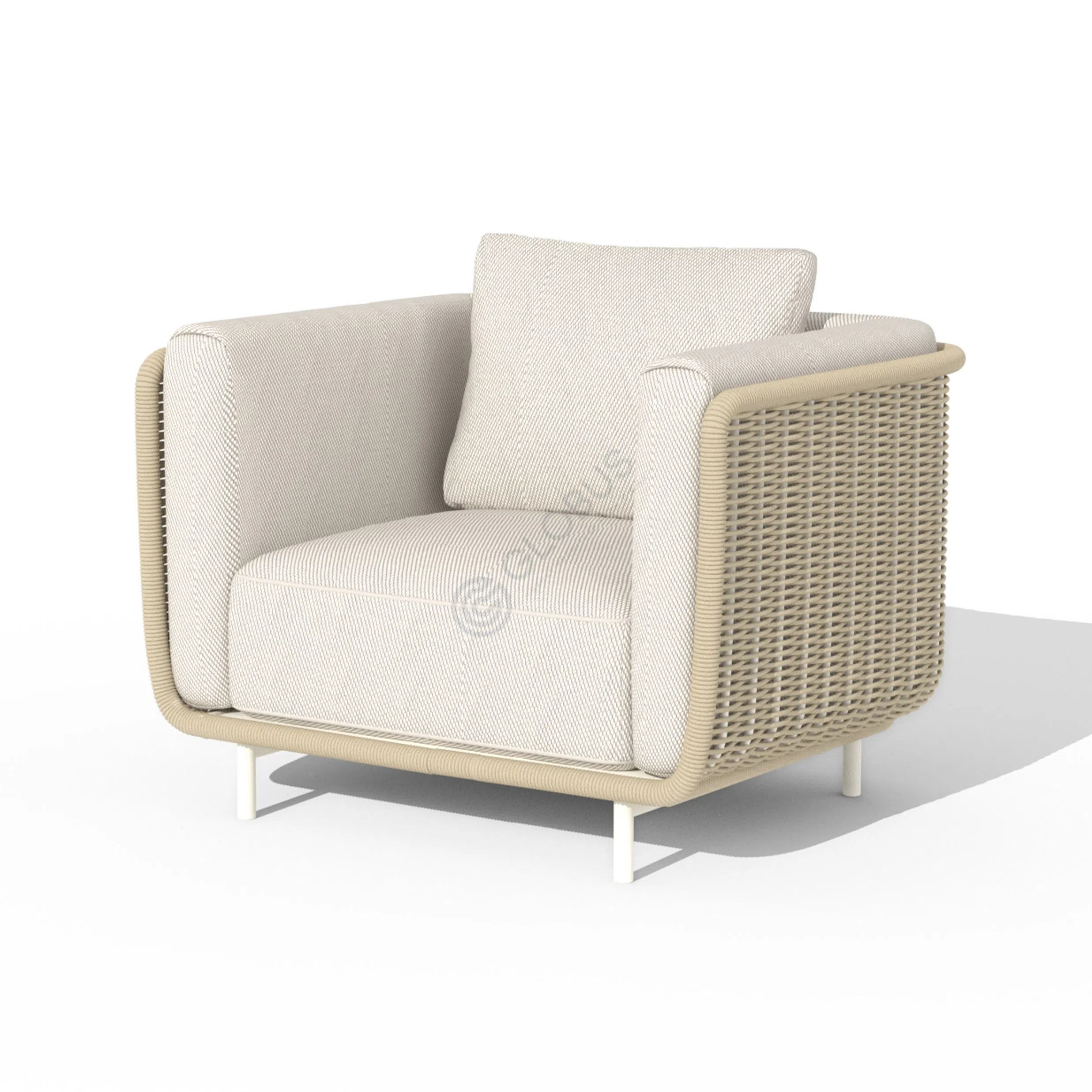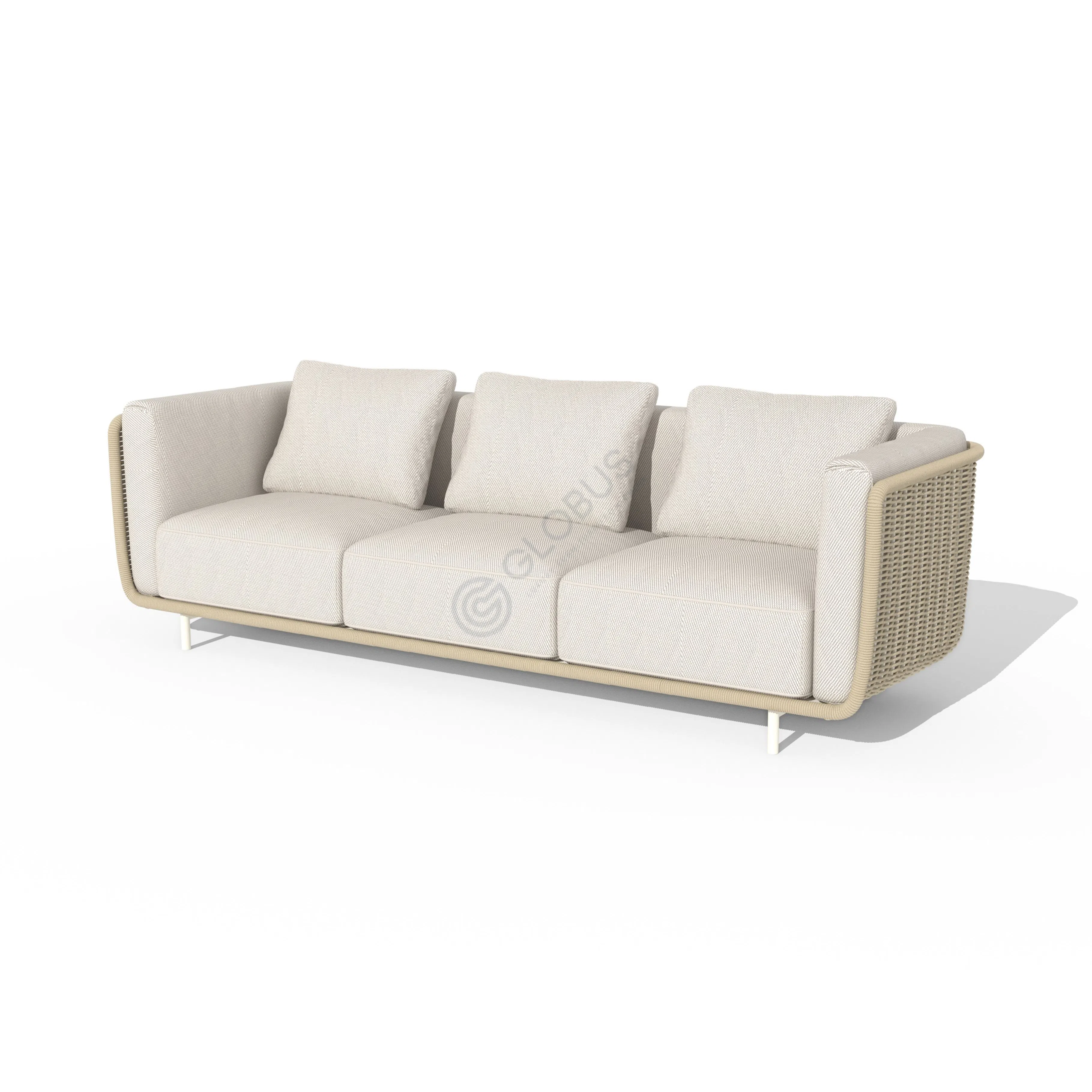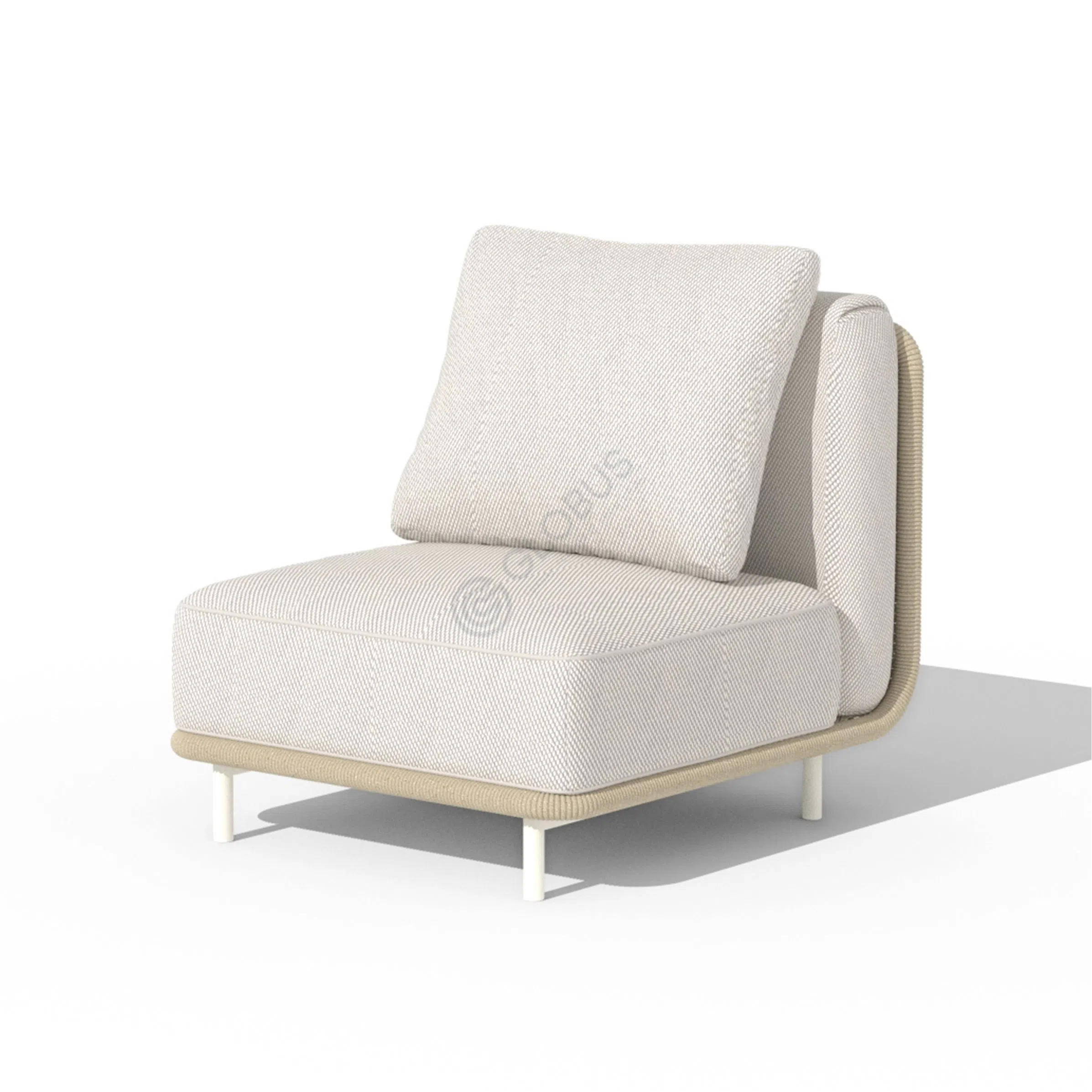 Каркас изделия выполнен из прочного алюминия, обеспечивающего надежную основу. Мягкое сиденье и спинка обтянуты приятным на ощупь текстилем, приглашая расположиться с максимальным удобством. Особую выразительность придает боковая панель, искусно сплетенная из искусственного ротанга, добавляющая фактурный акцент и визуальную теплоту дизайну.