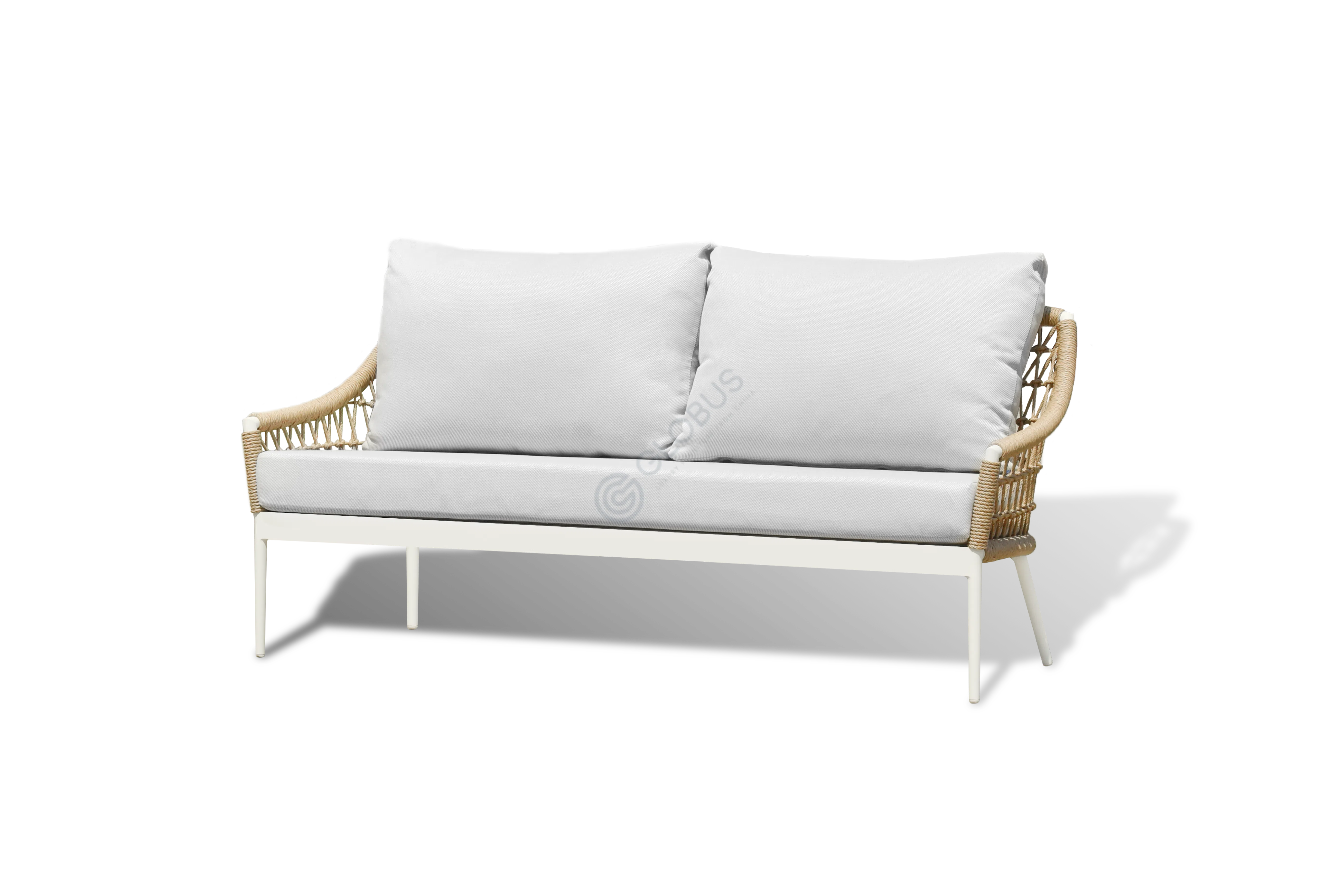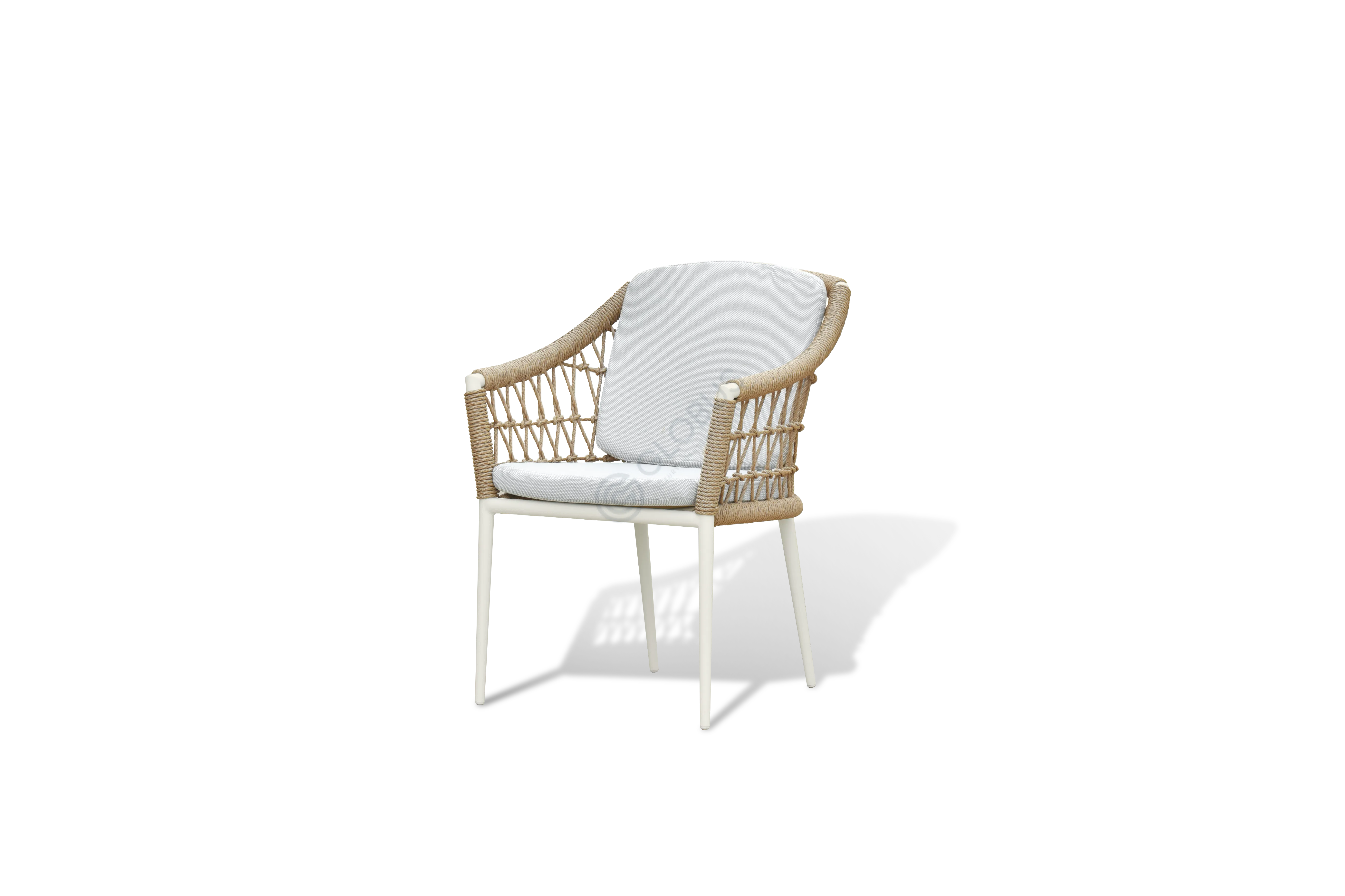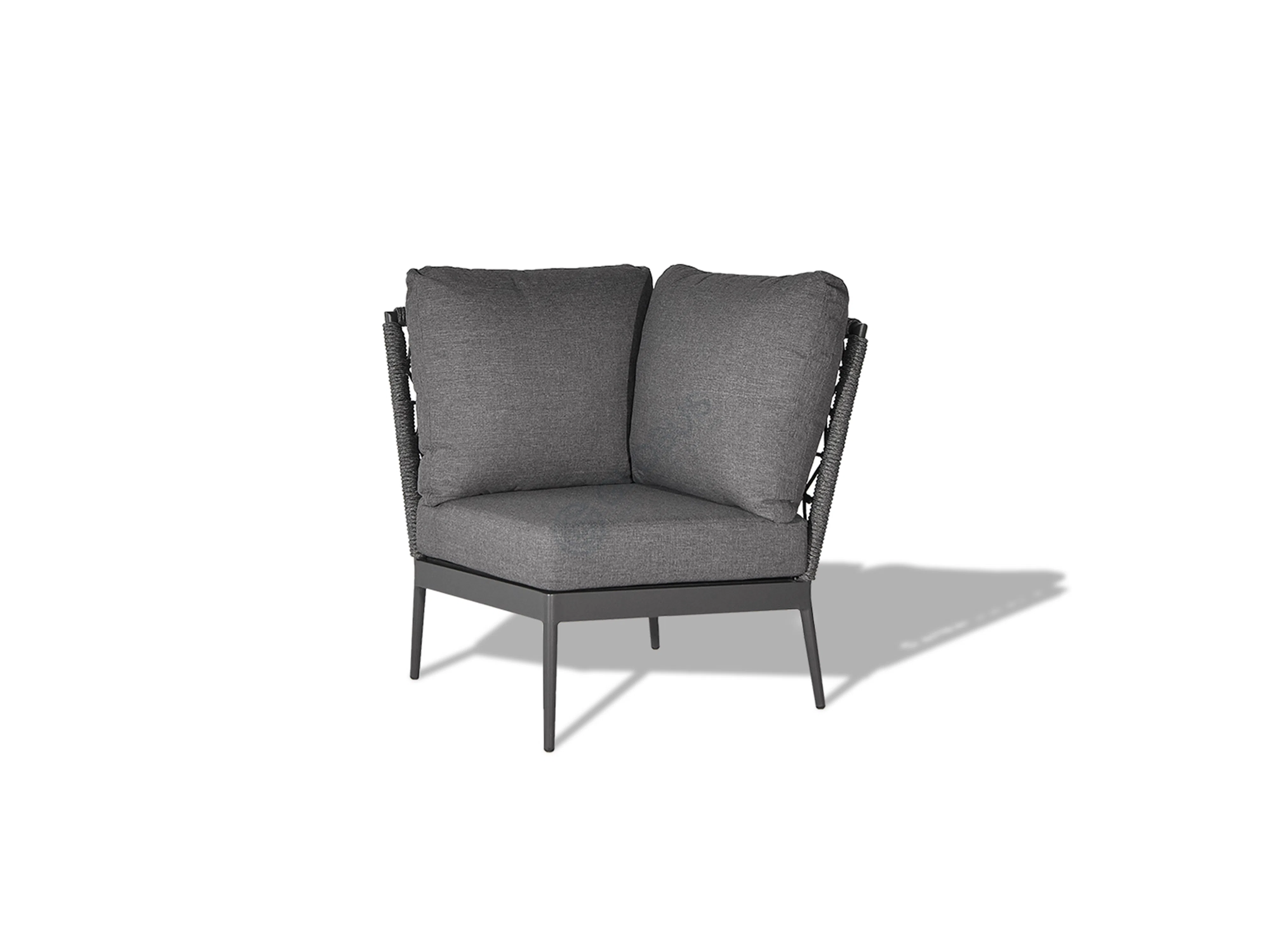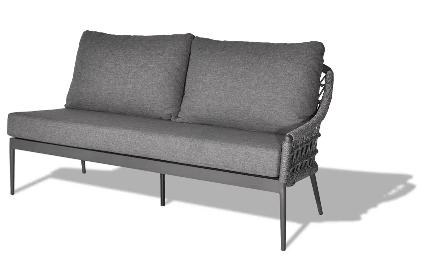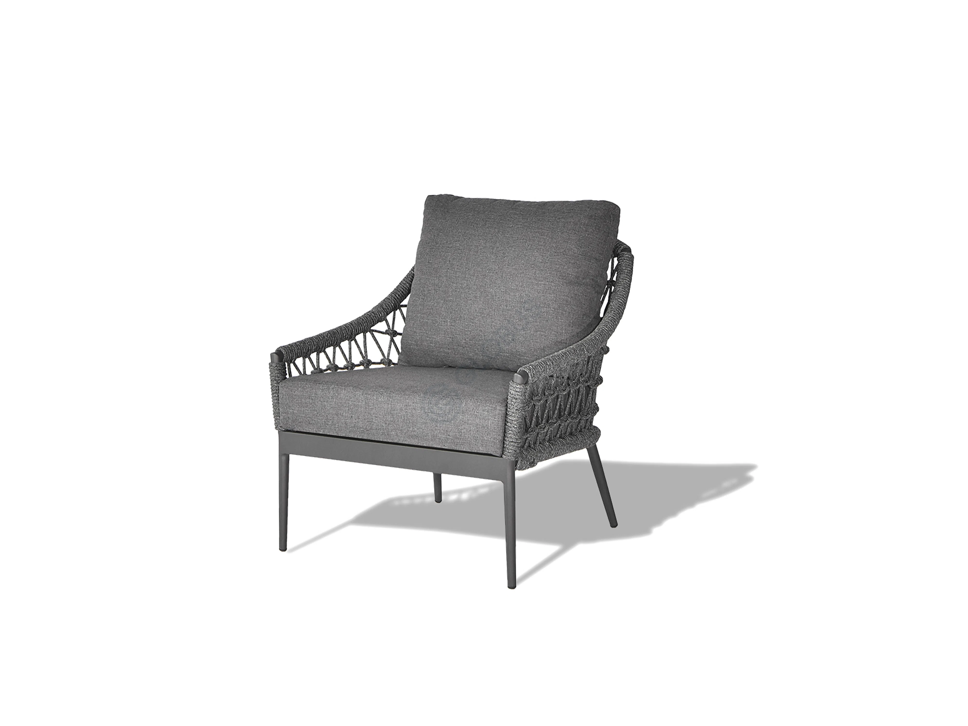 Каркас выполнен из прочного алюминия, обеспечивая надежность и легкость конструкции, устойчивой к внешним воздействиям. Изящное плетение из высококачественной верёвки обволакивает силуэт, добавляя текстурную глубину и визуальную привлекательность, одновременно являясь частью несущей структуры. Мягкие подушки, обитые премиальным текстилем, приглашают расслабиться и погрузиться в атмосферу спокойствия.