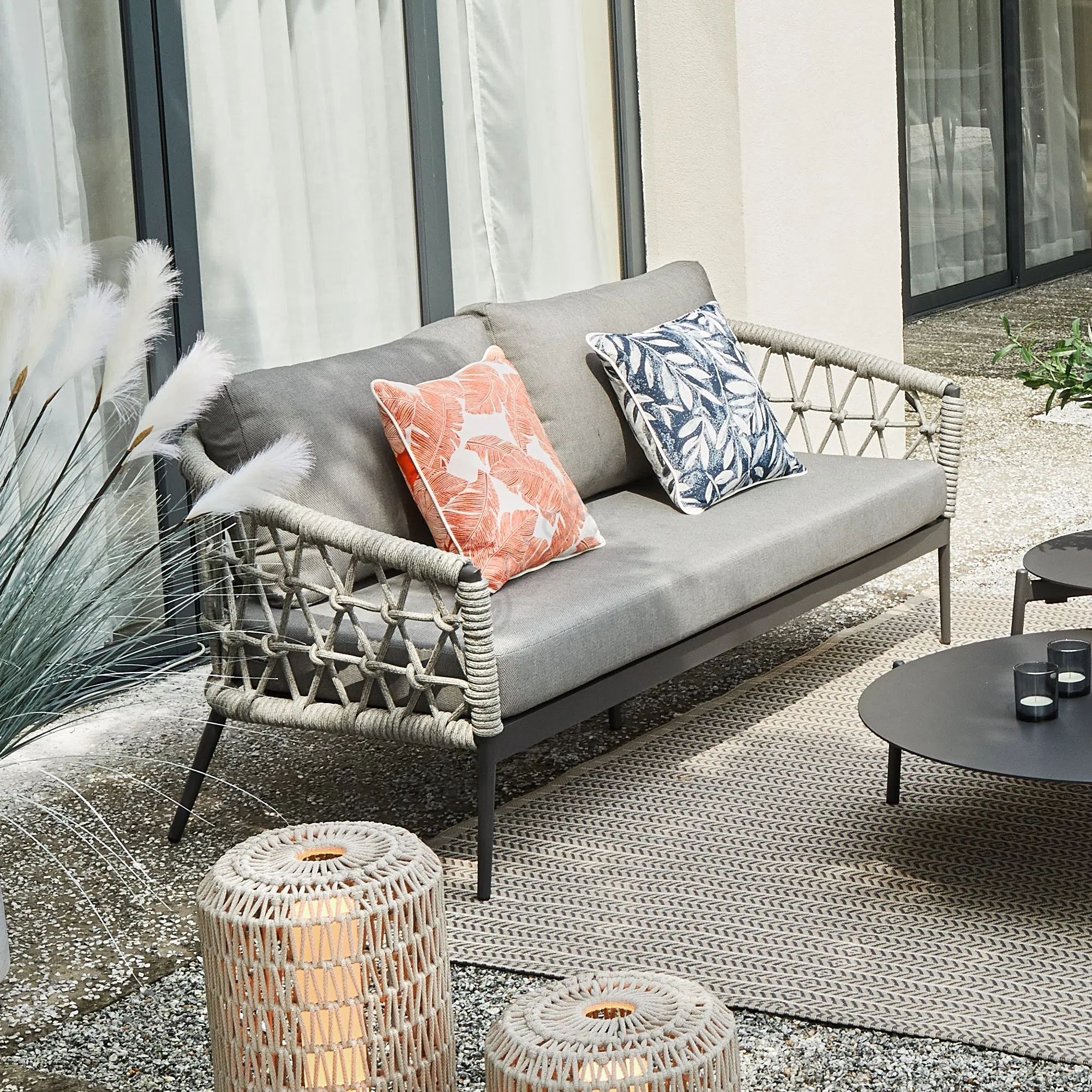 Легкий, но прочный алюминиевый каркас формирует надежную основу конструкции. Мягкая текстильная подушка обеспечивает максимальное удобство, приглашая расслабиться и насладиться моментом. Особенный шарм придает спинка, выполненная методом плетения из качественной верёвки, добавляя изделию уникальную фактуру и визуальный интерес.