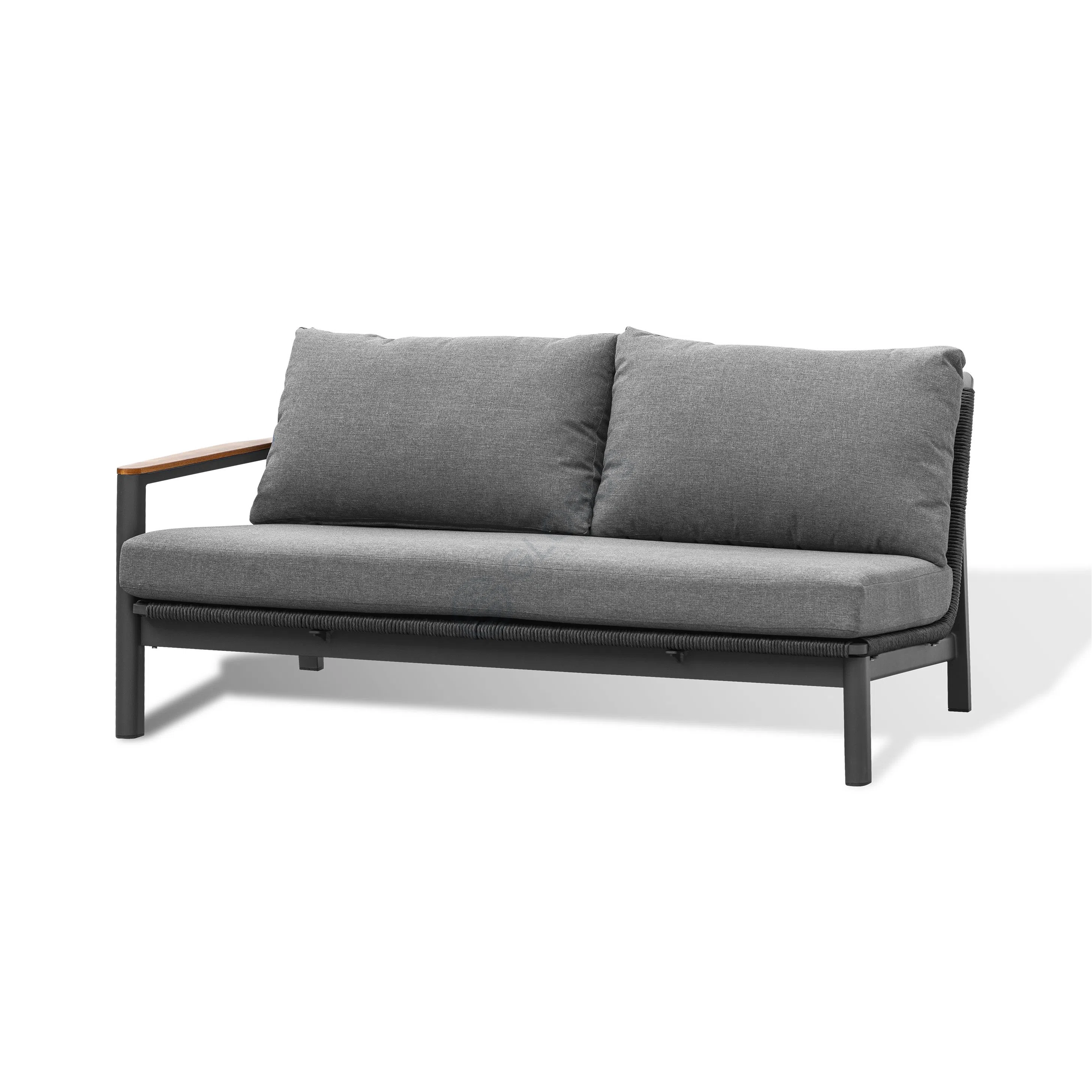 Основание модуля выполнено из прочного алюминия, обеспечивающего легкость конструкции и устойчивость к внешним воздействиям. Боковые и задние части оформлены плетением из искусственного ротанга, которое придает изделию выразительную текстуру и утонченный вид. Высококачественный текстиль подушек гарантирует мягкость и приятные тактильные ощущения, дополняя образ элегантностью.
