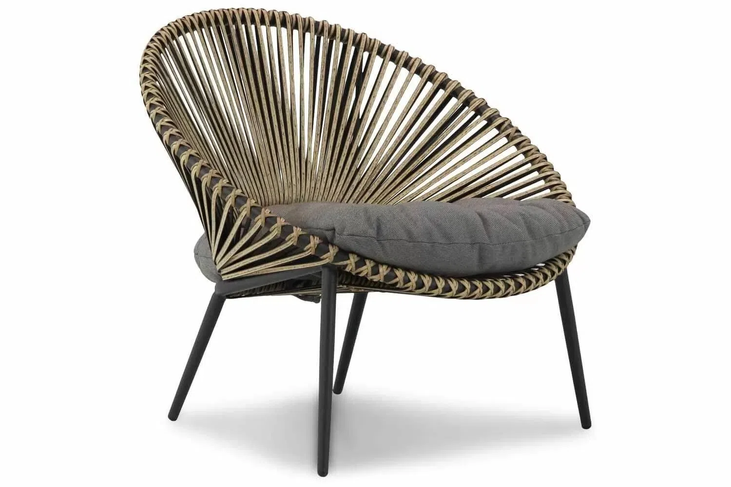 Основу составляет прочный алюминиевый каркас, обеспечивающий легкость конструкции и устойчивость к внешним воздействиям. Спинка выполнена из искусственного ротанга с уникальным плетением, добавляющим фактурный акцент и воздушность облику. Сиденье украшено мягким текстильным элементом, приглашающим расположиться с комфортом.