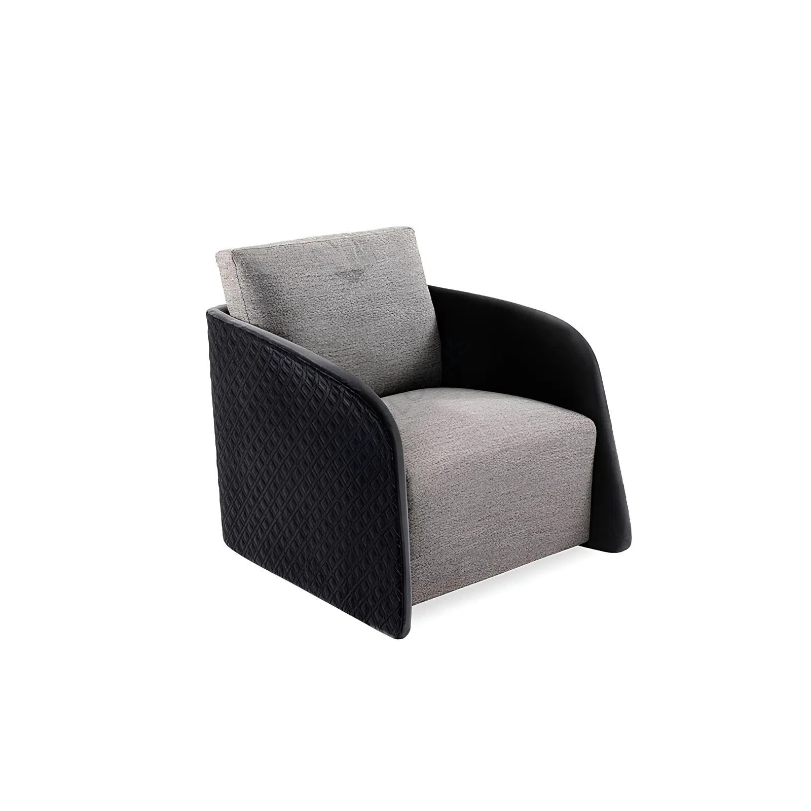 Основа конструкции выполнена из прочного натурального дерева и высококачественной фанеры, что гарантирует долговечность и стабильность. Обивка основного сиденья и спинки — это мягкий и приятный на ощупь текстиль, отличающийся утонченной текстурой, которая добавляет глубины общему серому оттенку. Боковые элементы подлокотников, отделанные экокожей на микрофибре, демонстрируют элегантное объемное плетение, контрастирующее с гладкими внутренними изгибами. Это сочетание материалов придает предмету мебели роскошный вид и тактильную привлекательность.