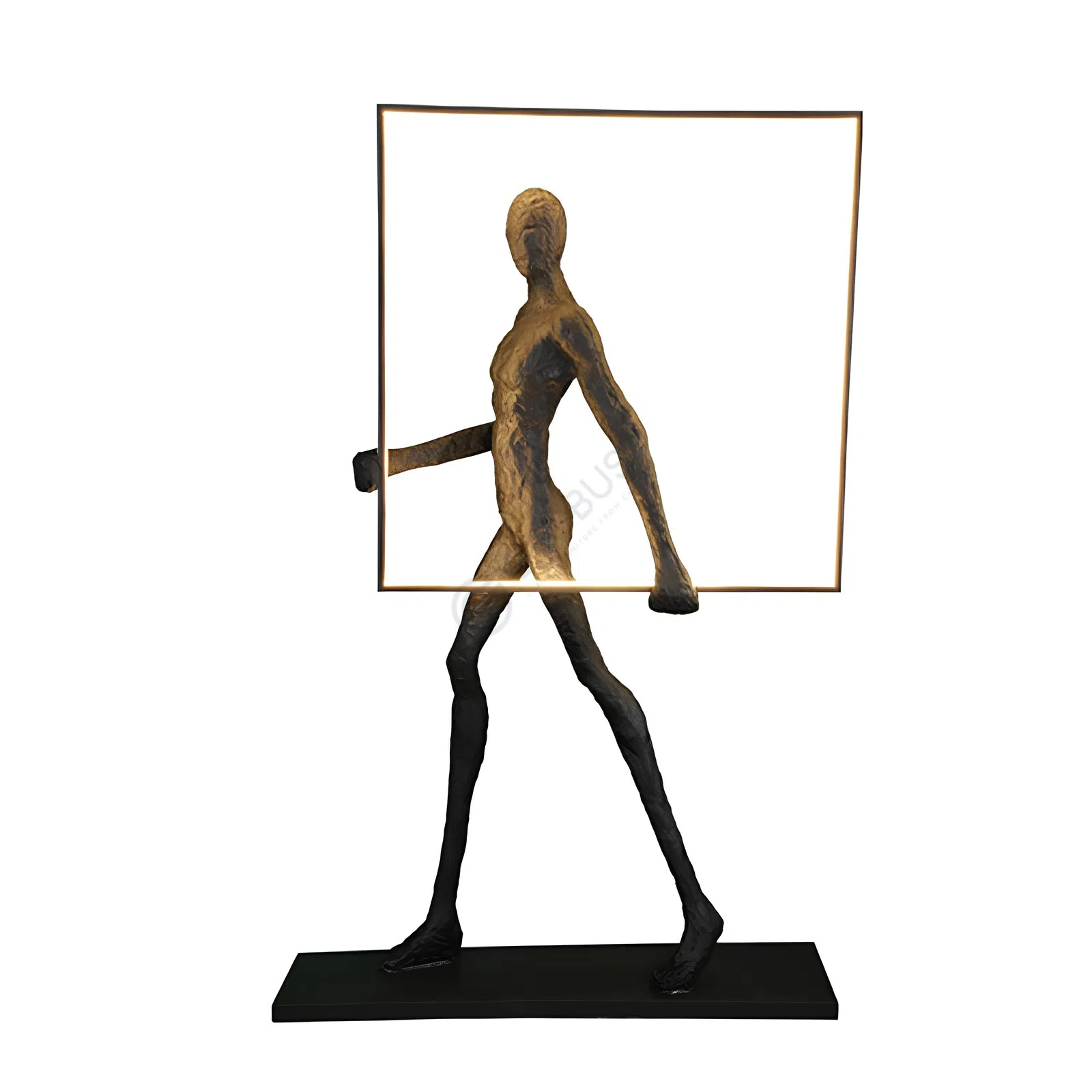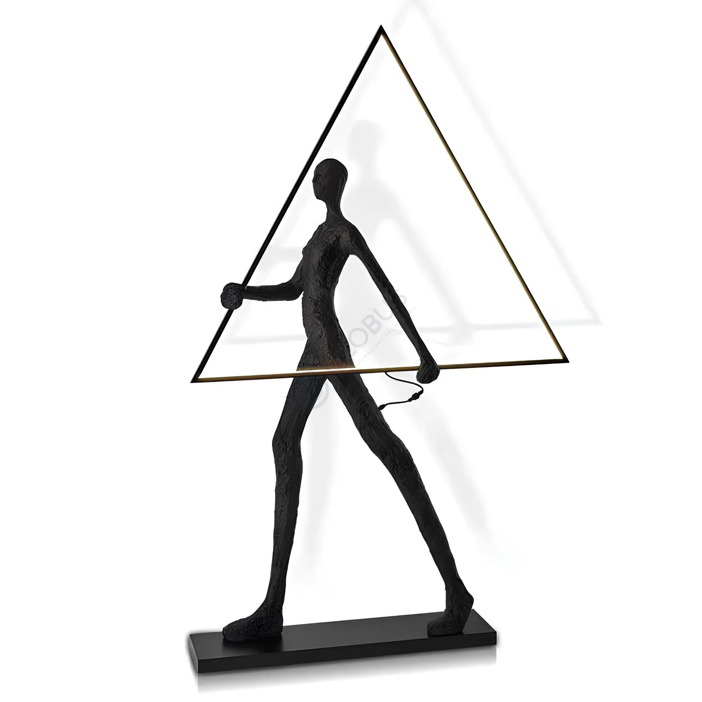 Этот предмет интерьера является выразительным акцентом, сочетающим функциональность освещения и объект современного искусства. Он представляет собой динамичную фигуру, словно застывшую в движении и держащую в руках сияющий обруч.