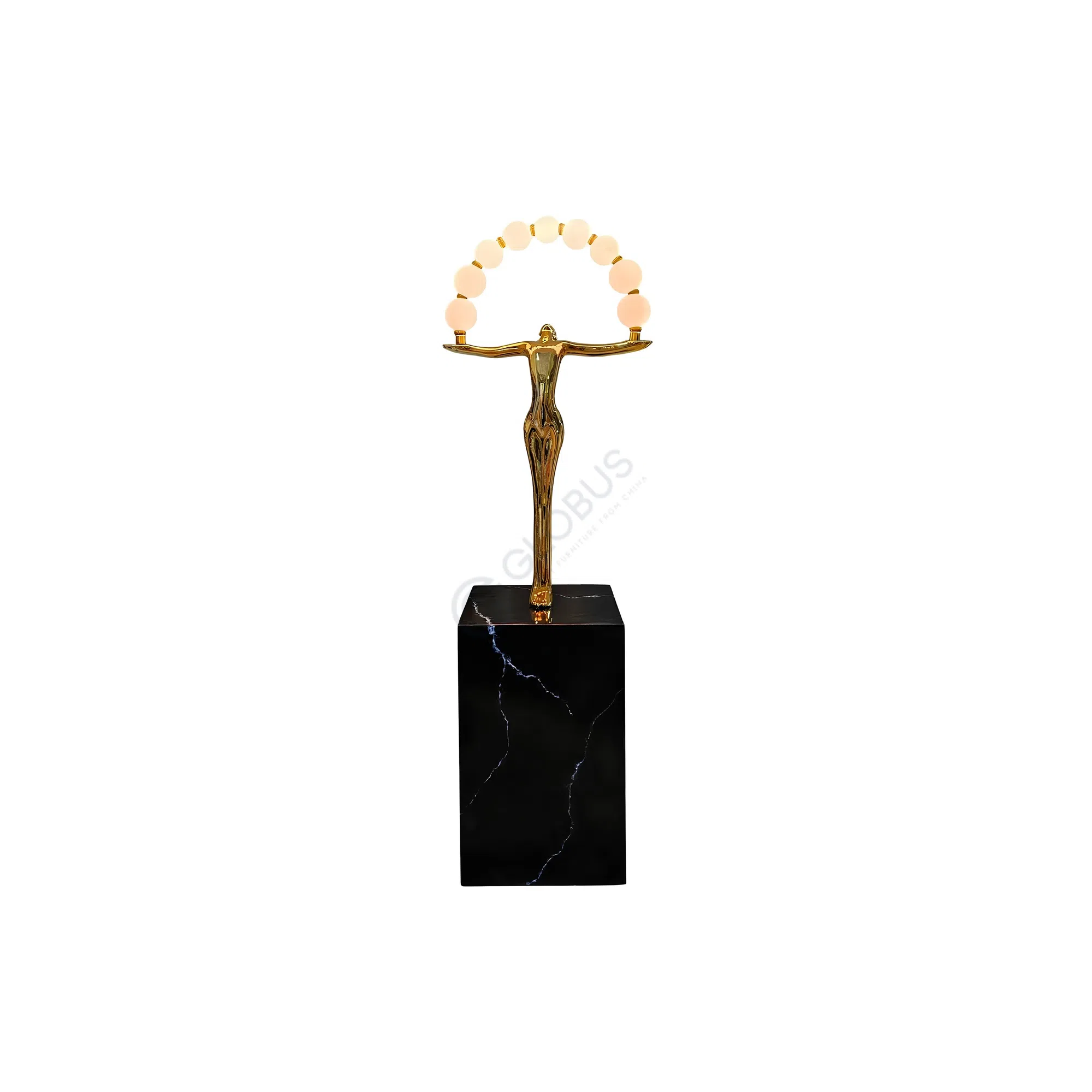 Корпус выполнен из высококачественного стеклопластика, который придает объекту гладкую и безупречную поверхность. Основание из прочного металла обеспечивает устойчивость. Над расправленными руками скульптуры венцом расположилось полукружие из источников света, формируя ореол мягкого сияния.