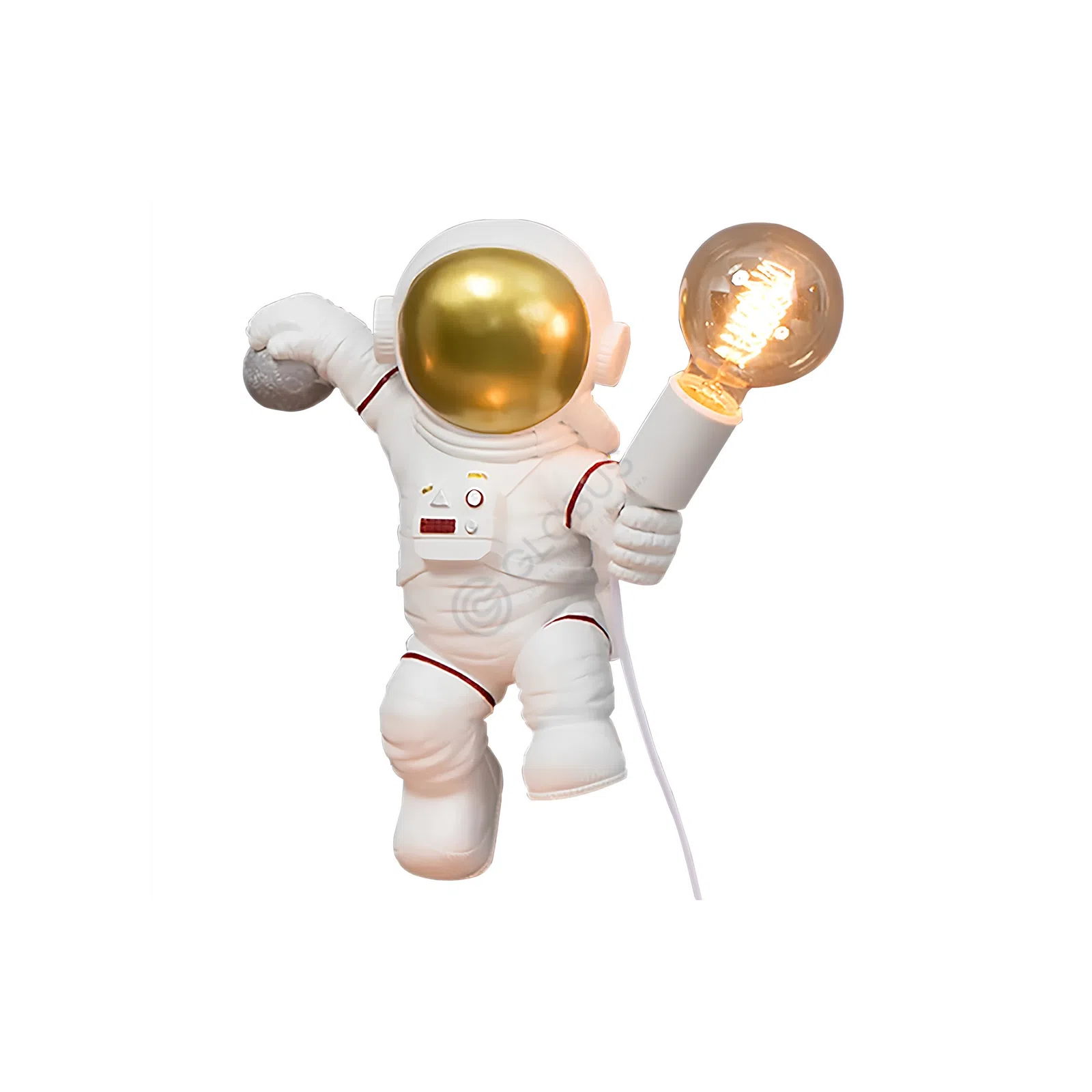 В руке у фигурки расположен плафон, имитирующий Луну, который мягко рассеивает свет. Это создает уютное и спокойное освещение, идеальное для вечернего времени или чтения сказок. Золотистый шлем астронавта добавляет элегантности и футуристичности общему облику.