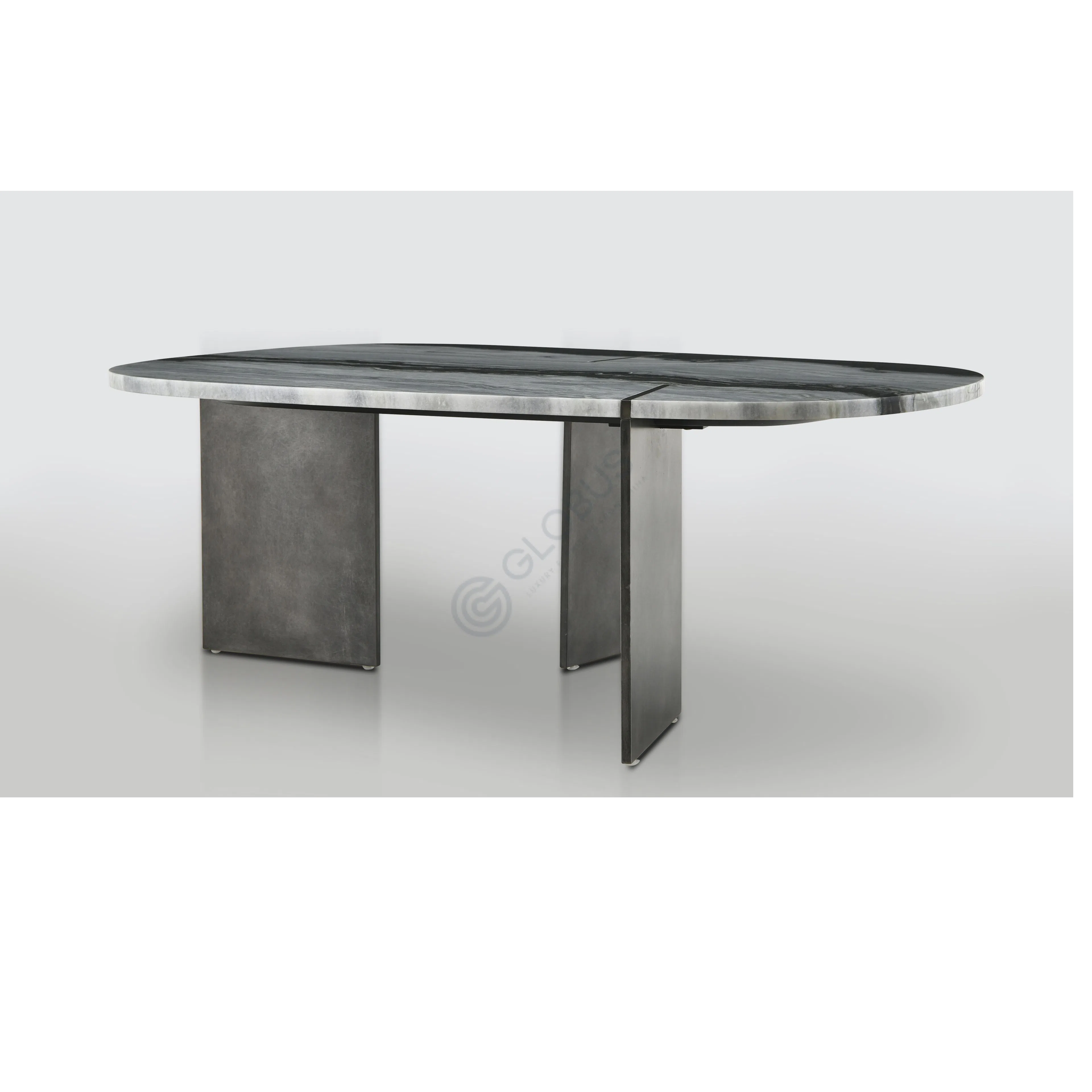 Основание столика искусно сконструировано из высококачественной нержавеющей стали. Строгие вертикальные элементы создают ощущение легкости и воздушности, при этом обеспечивая надежную устойчивость. Сочетание холодного блеска металла и благородной текстуры камня подчеркивает статус и современный дизайн предмета.
