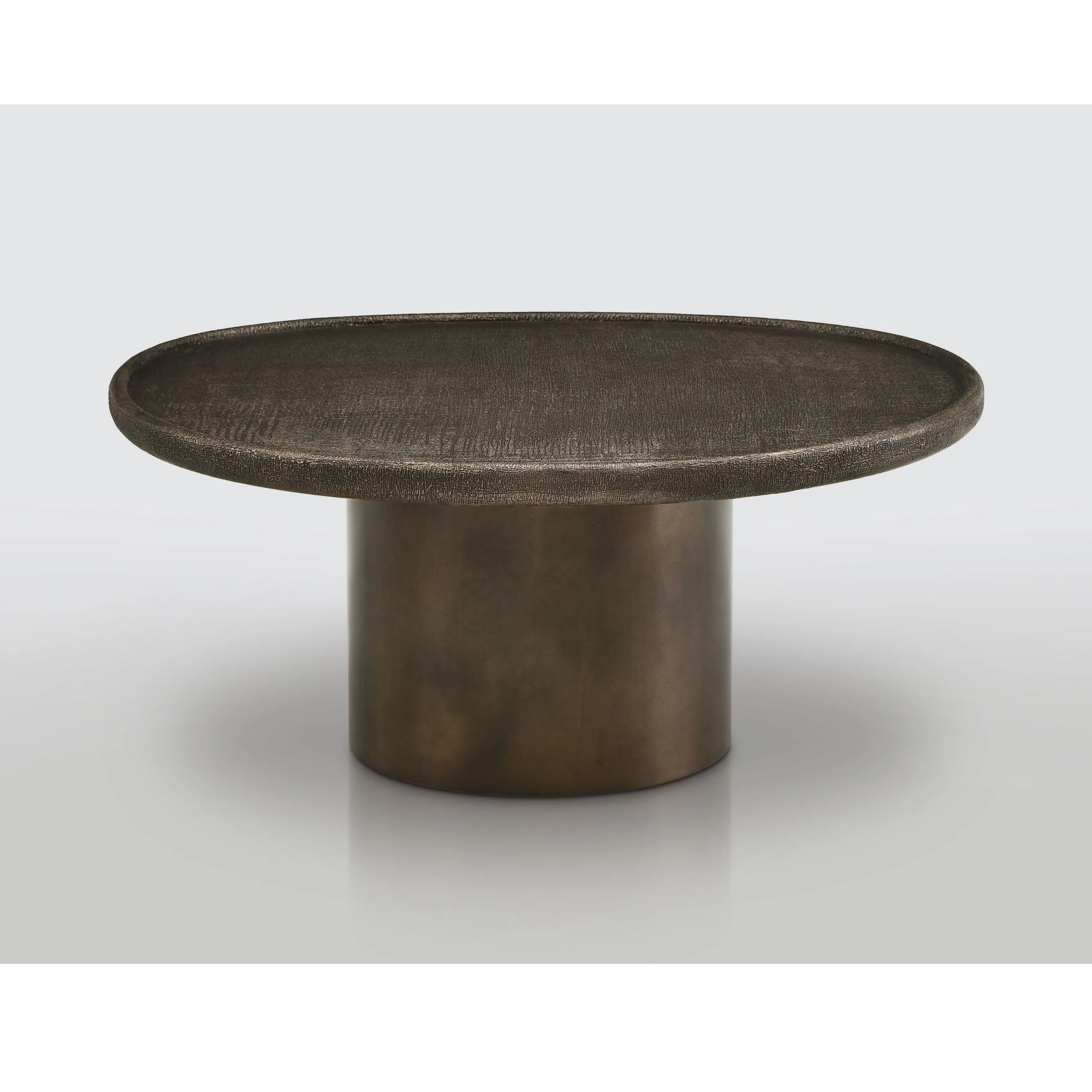 Круглая столешница, созданная из натурального дерева, обладает фактурной поверхностью с особым визуальным эффектом, напоминающим благородную патину. Эта комбинация материалов и специальной обработки придает предмету выразительную эстетику и ощущение прочности.