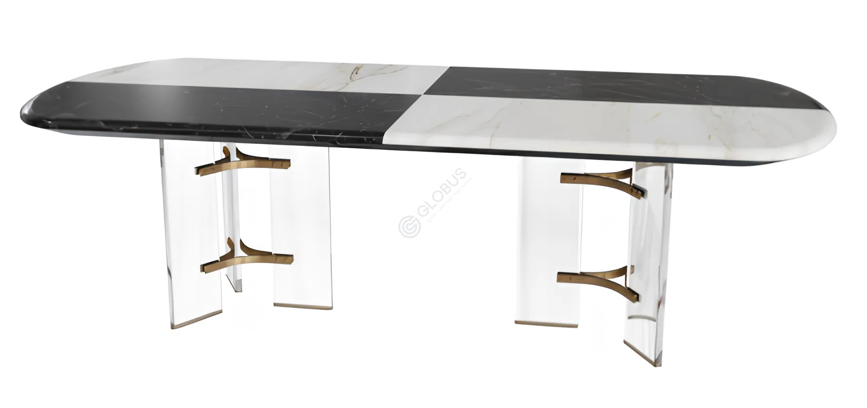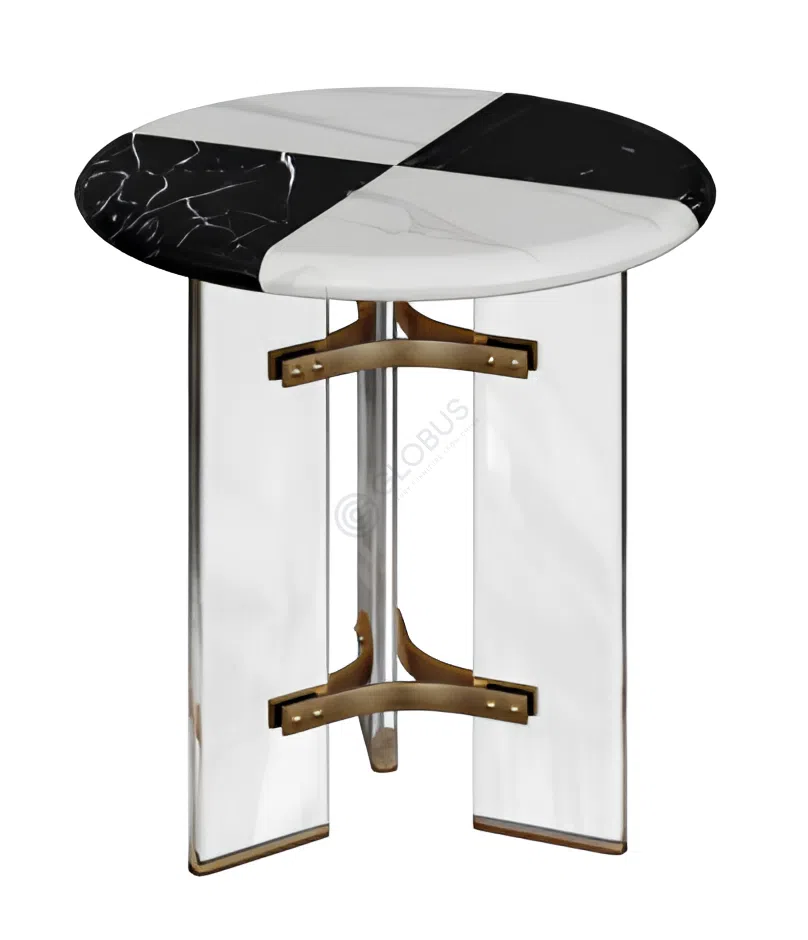 Опора столика, созданная из прозрачного акрила и полированной нержавеющей стали золотистого оттенка, придает конструкции легкость и одновременно демонстрирует прочность. Акриловые элементы создают ощущение парения столешницы, а изящная металлическая основа обеспечивает надежность и добавляет нотку изысканности. Такое сочетание материалов подчеркивает современный характер предмета мебели.