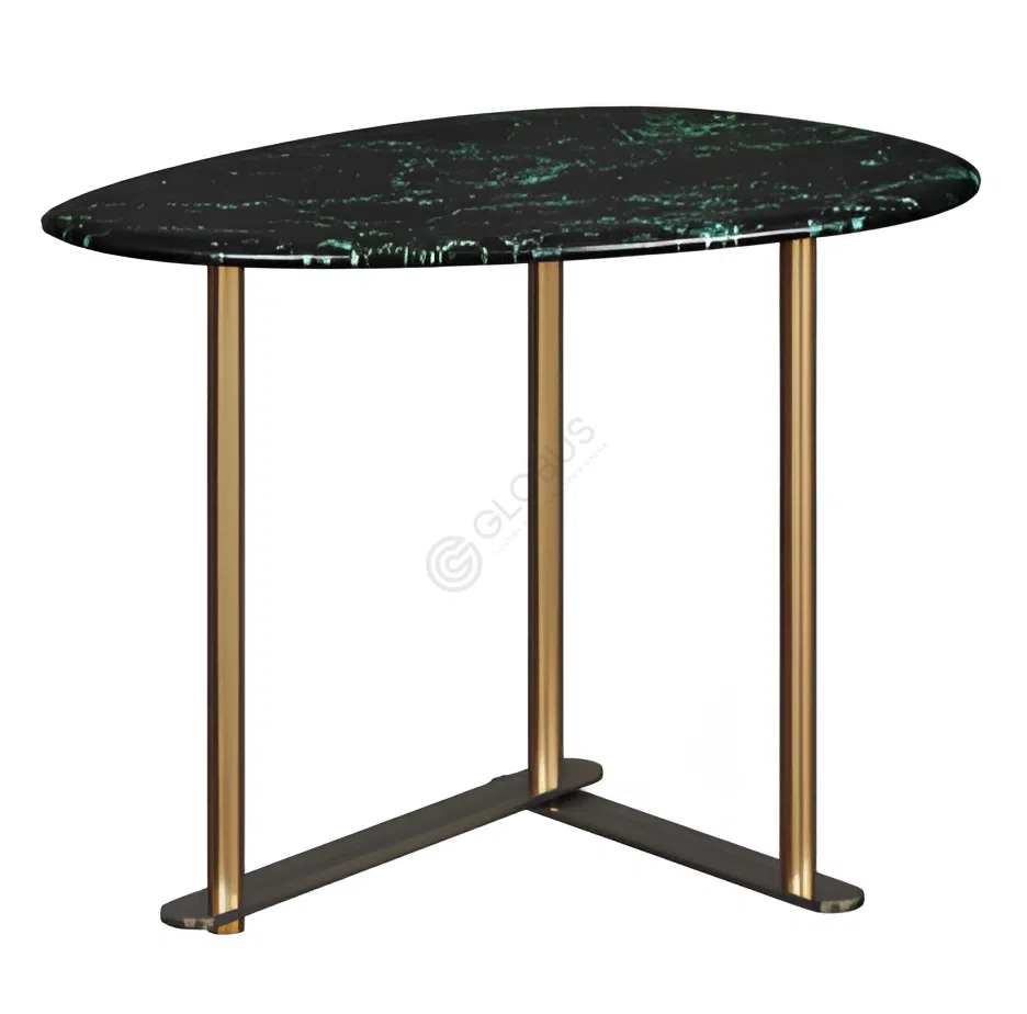 Сочетание благородного камня с элегантным металлом придает предмету мебели особую выразительность. Опоры, выполненные из нержавеющей стали с деликатной отделкой, обеспечивают не только надежную поддержку, но и выступают как самостоятельный декоративный элемент. Тонкие линии и продуманная геометрия основания подчеркивают легкость конструкции, несмотря на массивность столешницы.