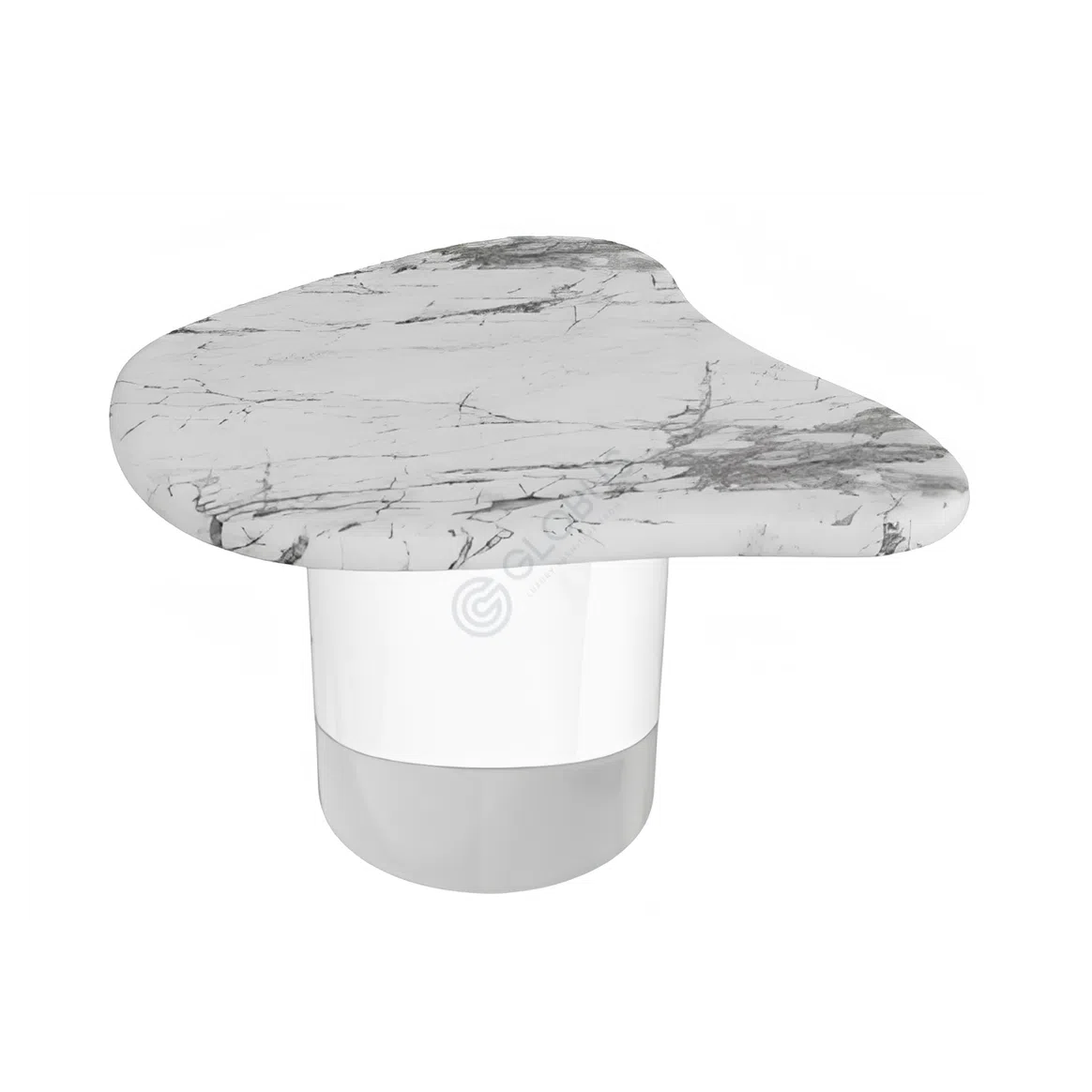 Журнальный столик, являющийся центральным элементом гостиной, обладает выразительным дизайном. Его столешница имеет уникальную, органическую форму, напоминающую природный контур. Поверхность выполнена из натурального мрамора, каждый срез которого уникален своими узорами и оттенками, придавая изделию неповторимый характер.