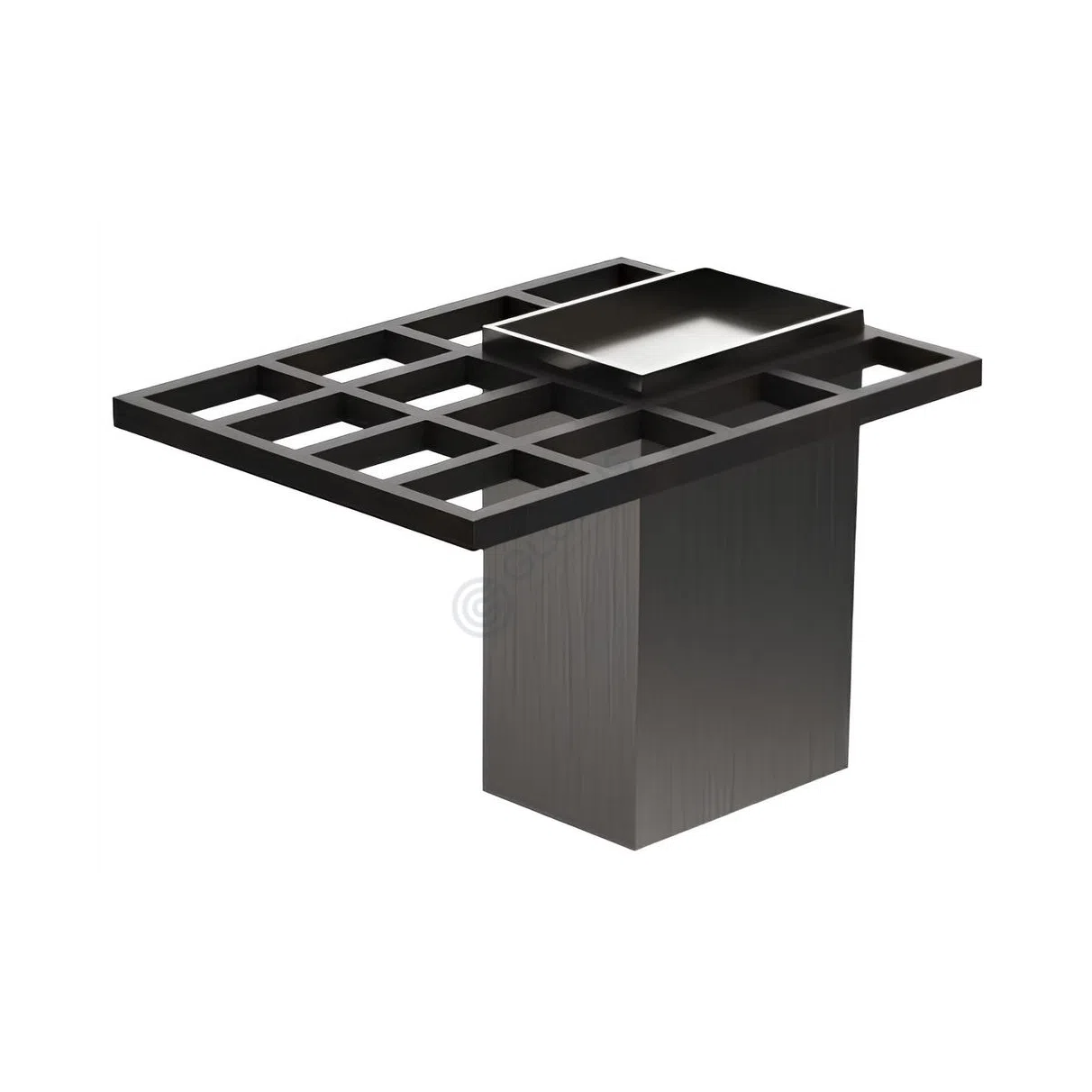 Продуманная структура включает множество ячеек по периметру, которые предлагают удобные возможности для хранения или эффектного размещения декоративных объектов. Центральная часть, заглубленная в поверхность, может служить как практичный поднос или элегантная ниша для композиций.
