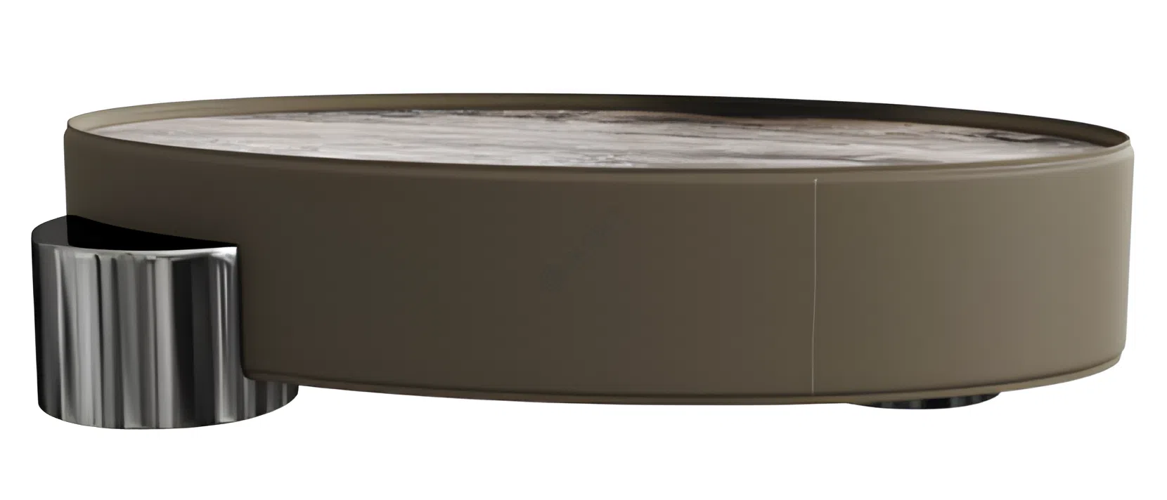 Созданный из сочетания благородных материалов, столик демонстрирует безупречное мастерство исполнения. Вертикальная опора, обтянутая шорно-седельной кожей, придает тактильное тепло и роскошный вид. Зеркальная полировка основания из нержавеющей стали добавляет современный лоск и обеспечивает надежную устойчивость.