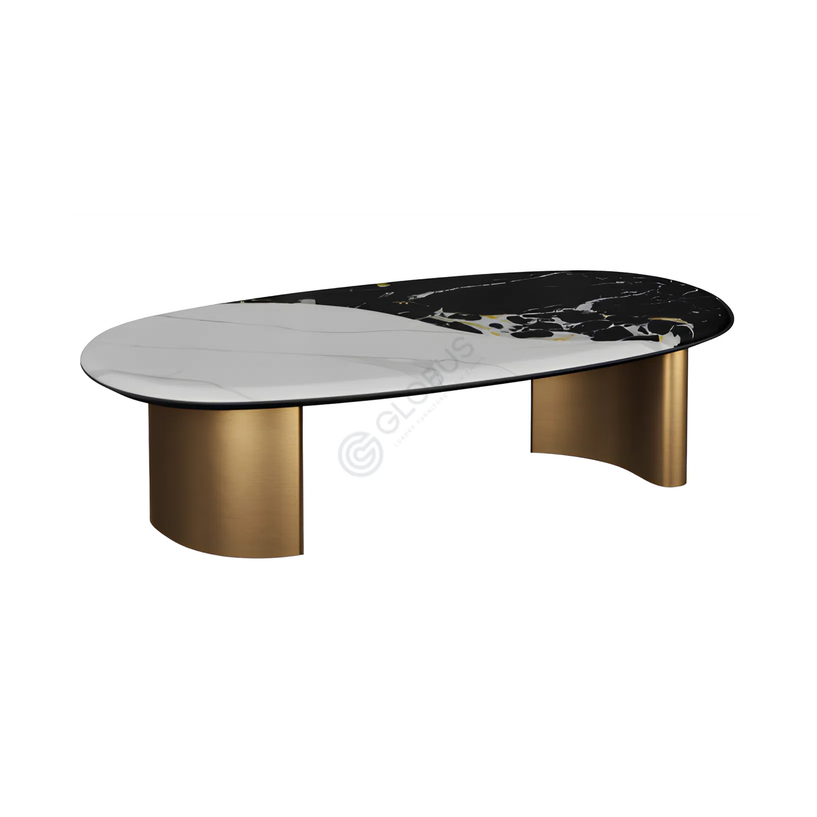 Поддерживает столешницу массивное основание из нержавеющей стали с благородным металлическим блеском. Две опоры плавной изогнутой формы не только обеспечивают превосходную устойчивость, но и служат важным элементом дизайна, подчеркивая современный стиль изделия. Гармония природного камня и металла создает образ роскоши и долговечности.