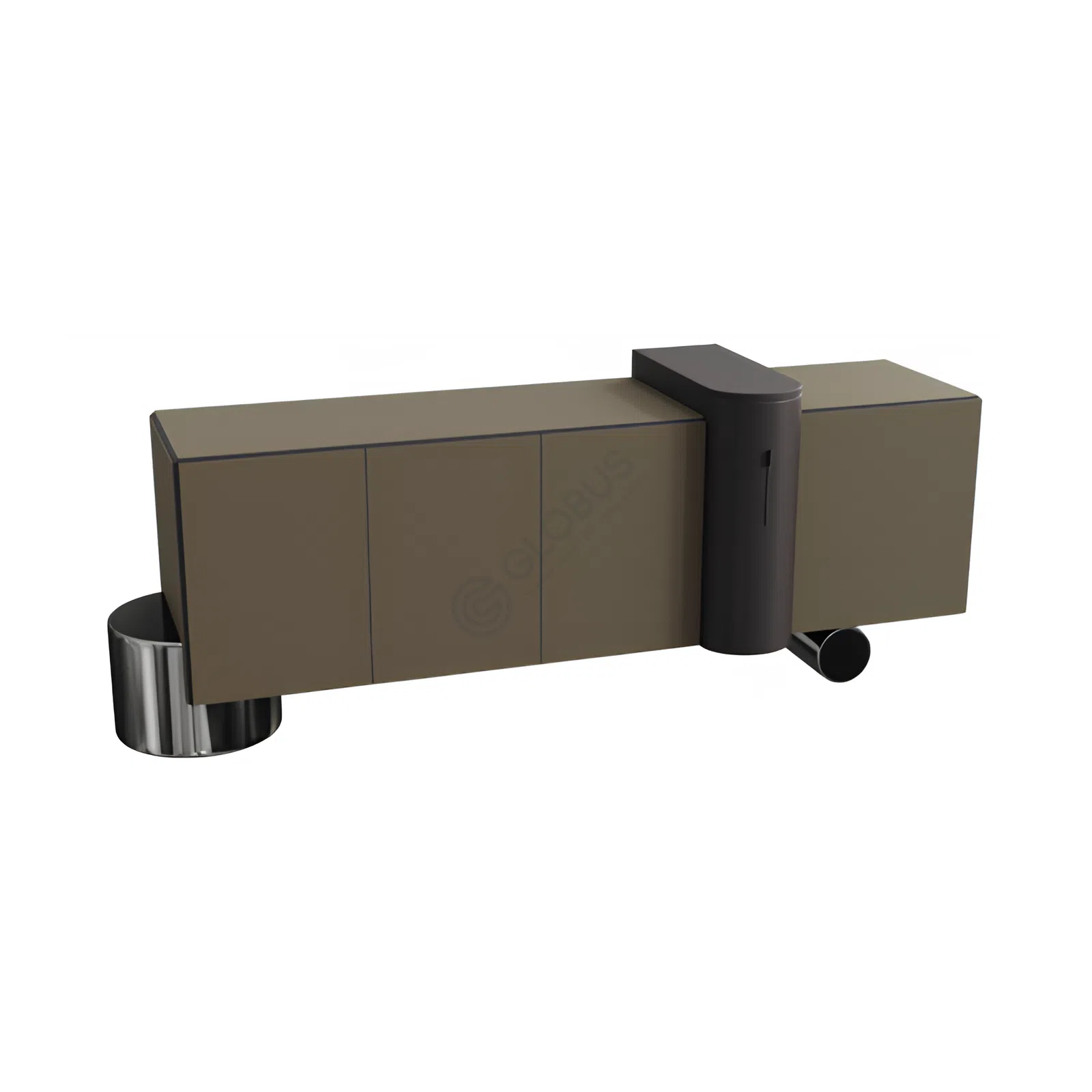 Основа предмета выполнена из прочного МДФ, покрытого тонким шпоном, что придает поверхности благородный вид и приятную текстуру натурального дерева. Геометрическая форма верха контрастирует с необычными опорами. Одна из ножек, выполненная из сияющей нержавеющей стали, привлекает внимание своей цилиндрической формой и рифленой фактурой. Вторая опора, отличающаяся плавным изгибом, подчеркивает асимметрию и динамичность композиции. Внутреннее наполнение или отдельные элементы могут включать шорно-седельную кожу, добавляющую изделию тактильной роскоши и демонстрирующую высокое мастерство исполнения.