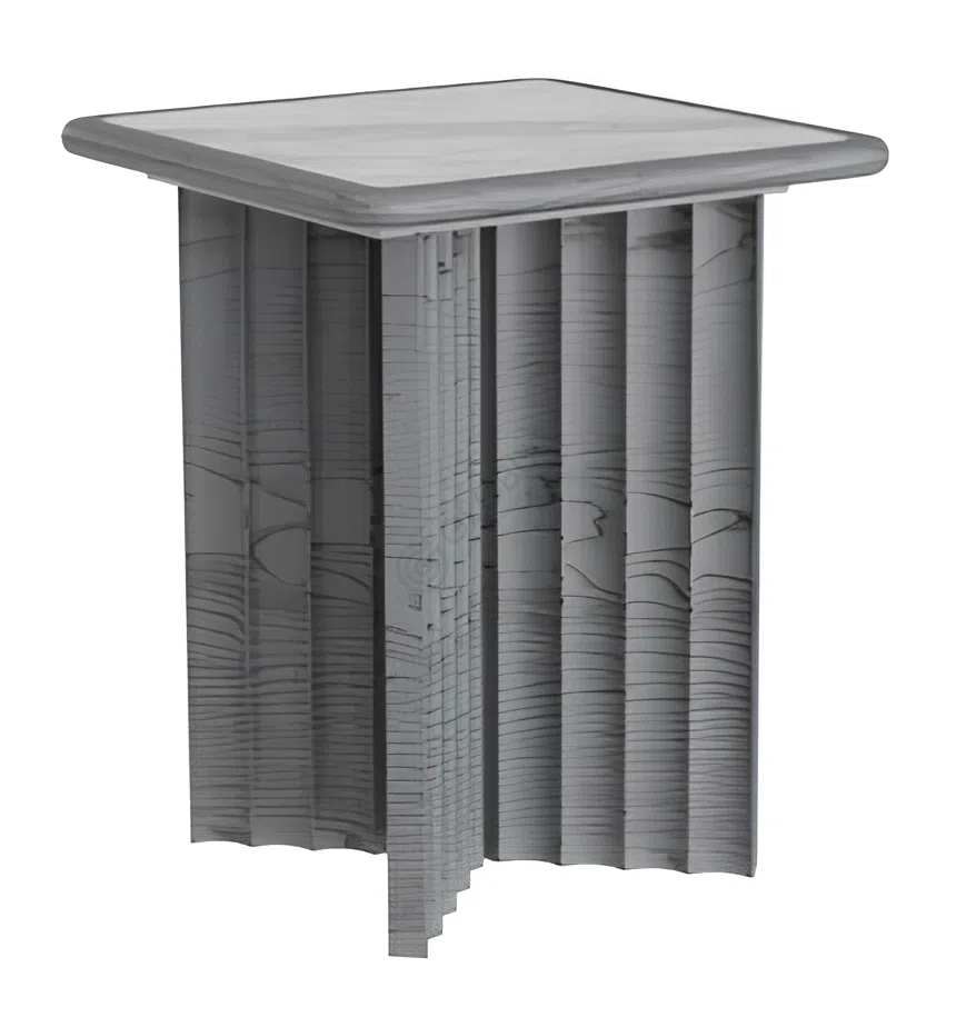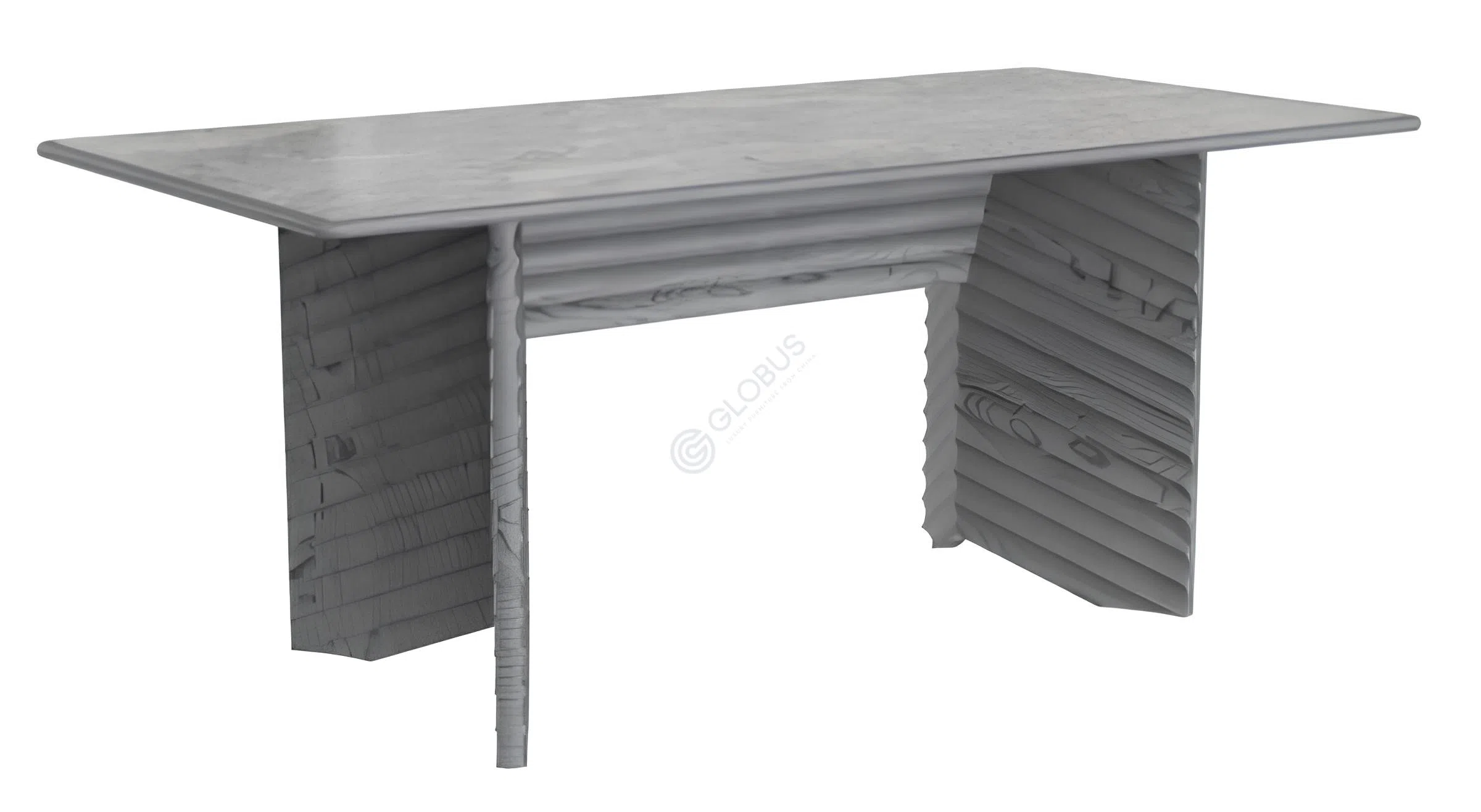 Основание стола отличается оригинальной архитектурной формой с вертикальными рельефными элементами. Эта фактурная деталь придает предмету мебели выразительность и динамичность. Конструкция изготовлена с применением натурального дерева, шпона, МДФ и фанеры, что обеспечивает надежность и стабильность, а также раскрывает теплоту и текстуру древесины.