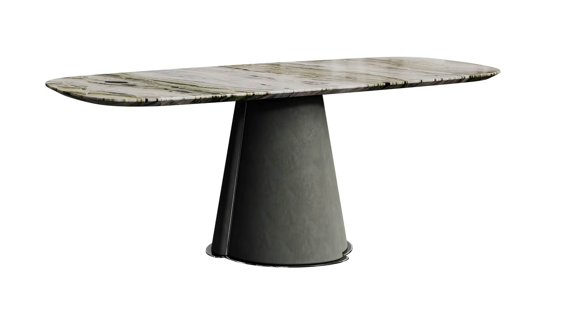 Массивное основание стола, изготовленное из прочной углеродистой стали, облицовано экокожей на микрофибре. Эта комбинация не только обеспечивает исключительную устойчивость конструкции, но и добавляет тактильной теплоты и визуальной мягкости к строгости металла. Лаконичная, но выразительная форма опоры придает ему монументальность и служит центральным элементом композиции.