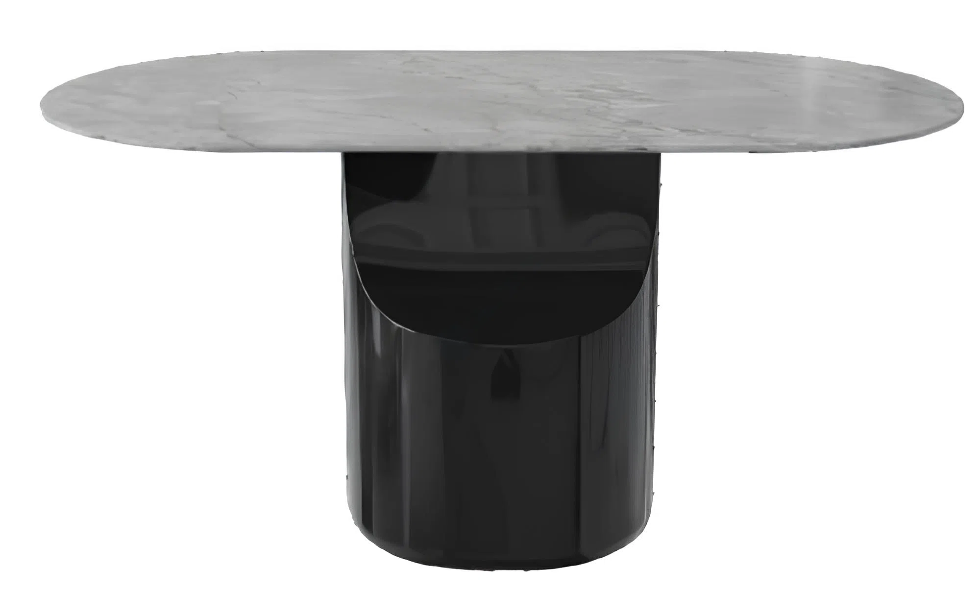 Массивное цилиндрическое основание стола имеет глубокий темный оттенок и глянцевое покрытие, создавая элегантный контраст с мраморным верхом. Конструкция основания, сочетающая МДФ и прочную фанеру, обеспечивает необходимую устойчивость, а финишное покрытие, возможно выполненное из шпона или лака, подчеркивает чистоту линий и форм.