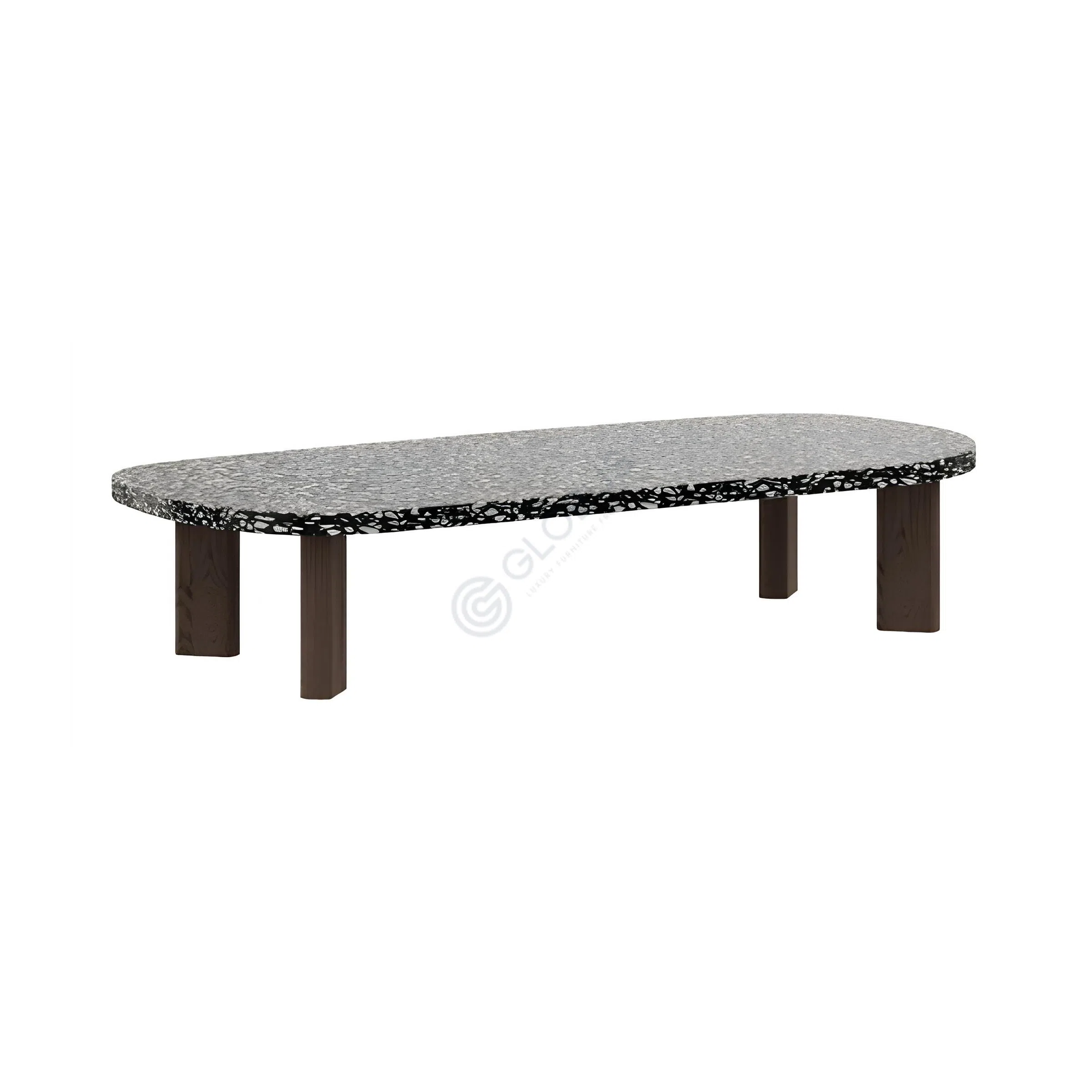 Поддержка из натурального дерева впечатляет продуманной формой ножек, которые гармонируют с общей концепцией стола. Теплая текстура древесины смягчает строгие линии мраморной поверхности, создавая сбалансированный образ. Конструкция обеспечивает надежность и поддерживает комфорт в процессе использования.