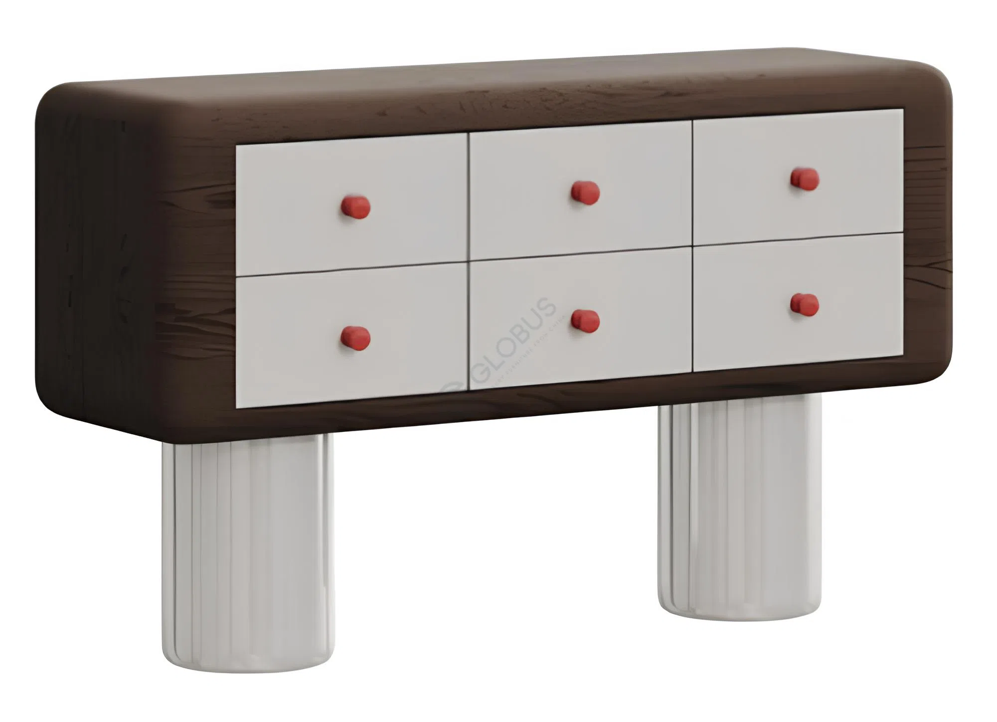 Белые ножки цилиндрической формы придают конструкции динамику и легкость. Их гладкая поверхность идеально сочетается с темным корпусом, выполненным из прочного МДФ и фанеры. Выдвижной ящик оснащен лаконичной красной ручкой, добавляющей изделию яркий, но ненавязчивый акцент.