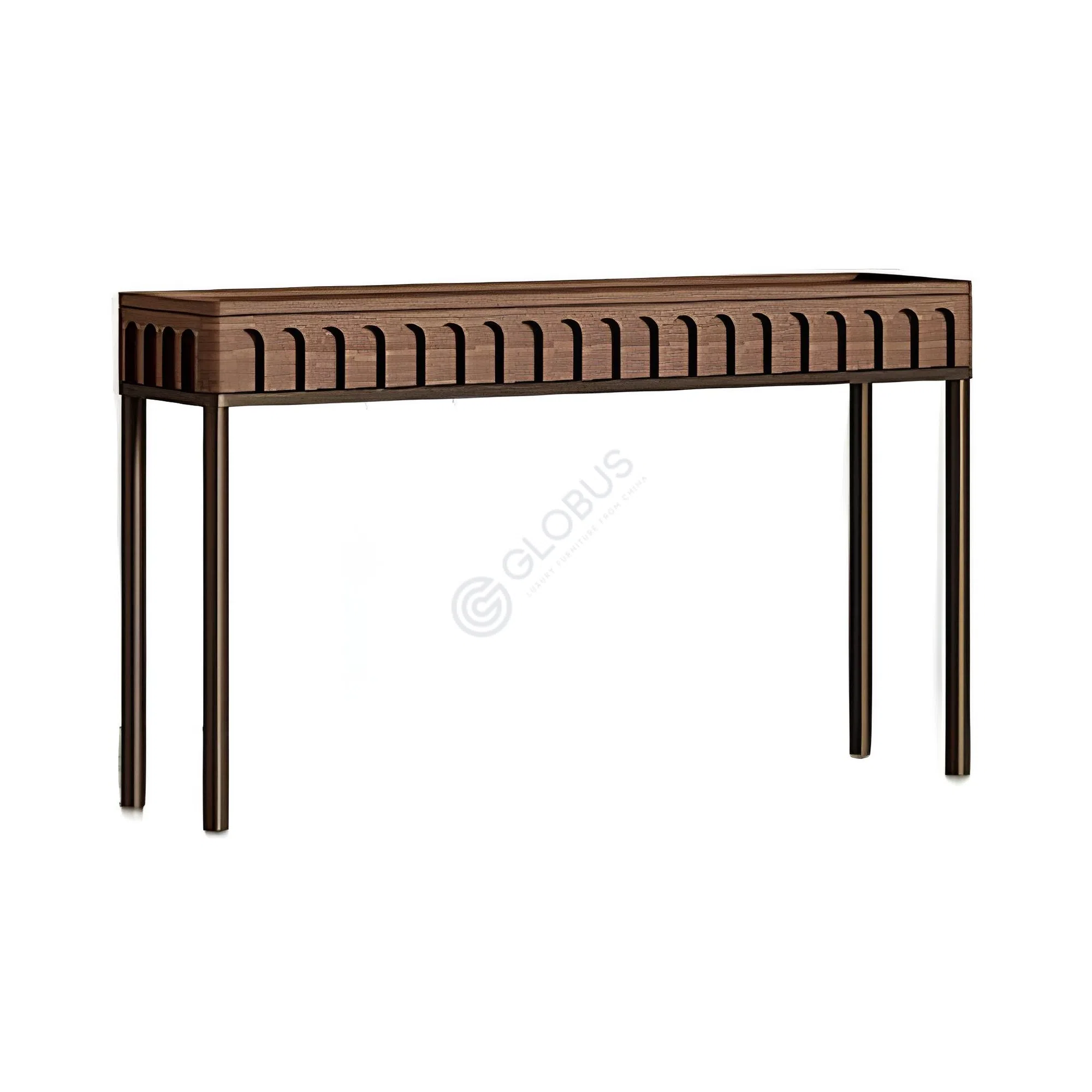 Эта консоль представляет собой гармоничное сочетание современного дизайна и утонченных материалов. Ее столешница выполнена из натурального дерева с изысканным шпоном, что придает изделию теплоту и природную текстуру. Интересный декоративный рельеф дополняет облик, делая предмет мебели выразительным, но не перегруженным.