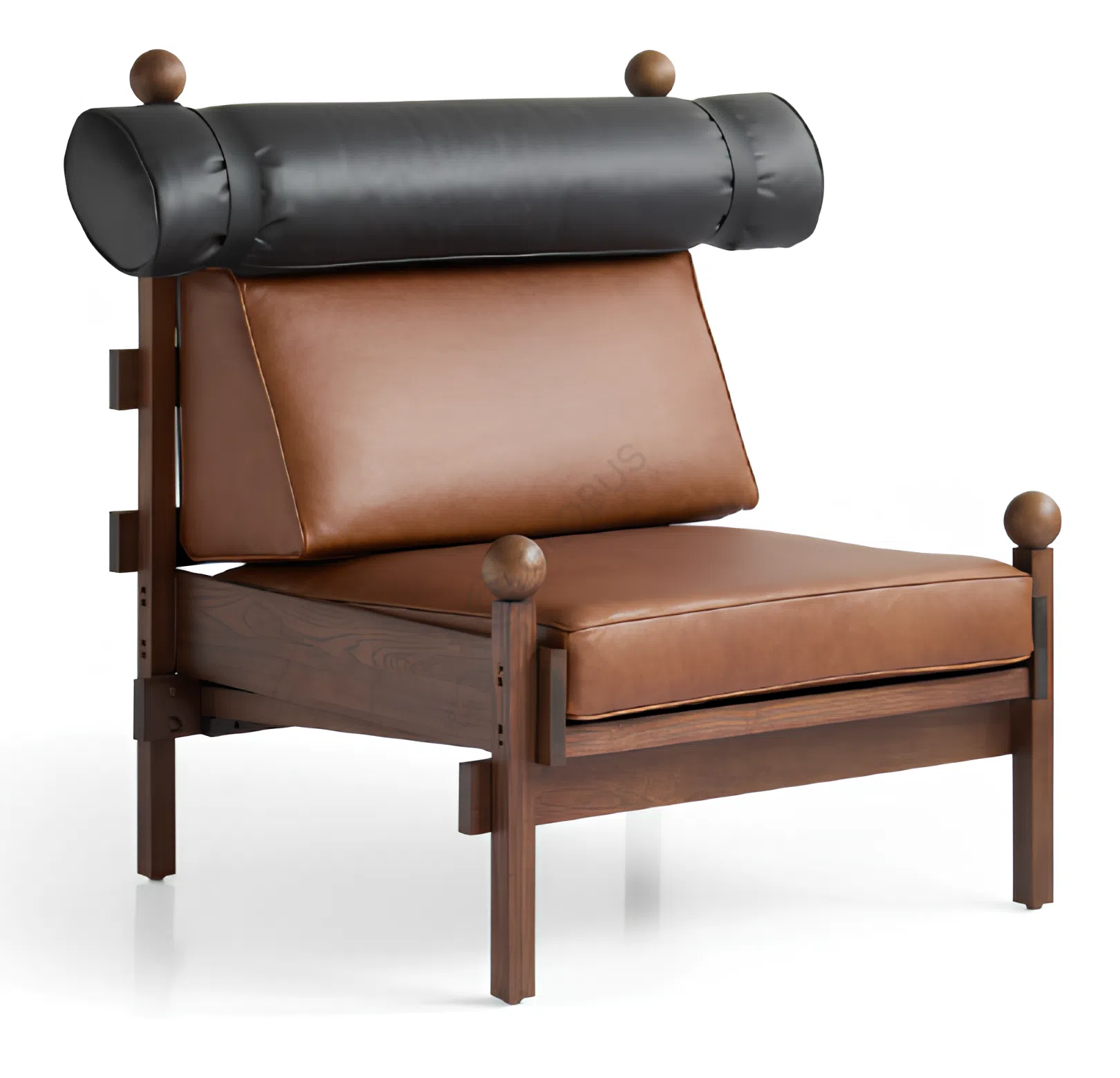 Мягкая обивка из шорно-седельной кожи гармонично сочетается с текстильными вставками, формируя контраст текстур и обеспечивая комфорт при использовании. Подушки спинки выполнены в оригинальном цилиндрическом формате, что добавляет выразительности общей композиции и делает отдых особенно уютным.