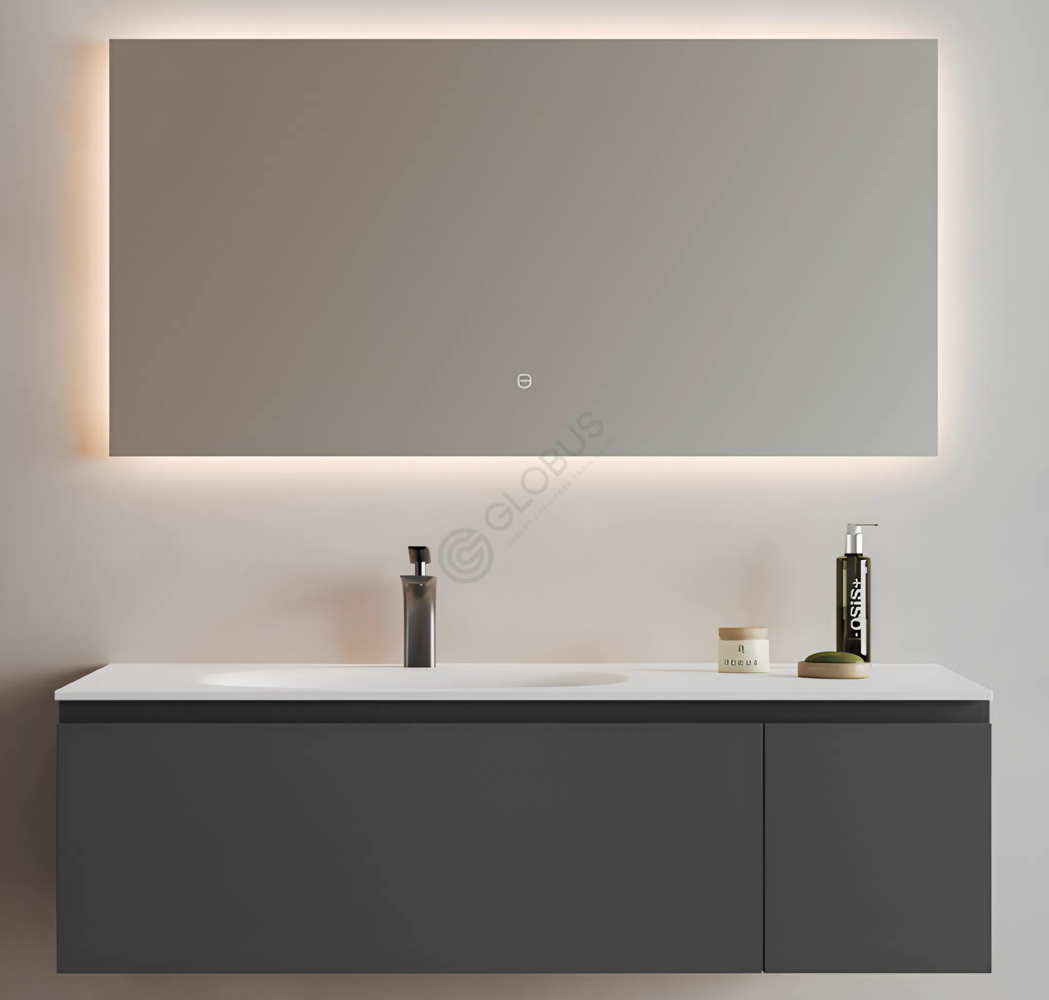 Корпус выполнен из фанеры, которая обеспечивает устойчивость и долговечность, а фасад отделан акриловым камнем, создающим изысканную гладкую поверхность. Такой материал устойчив к влаге и прост в уходе, что делает изделие особенно практичным для использования в условиях ванной комнаты.