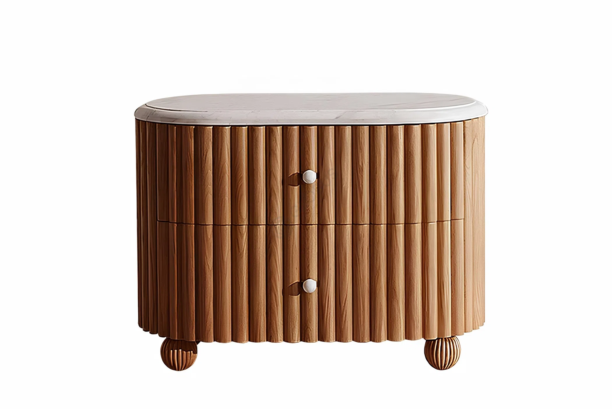 Комод в современном стиле сочетает изысканность натурального дерева с утонченностью мраморной столешницы. Фасад украшен рельефными вертикальными линиями, придающими композиции динамику и мягкость, а округлые формы делают предмет выразительным акцентом в интерьере.