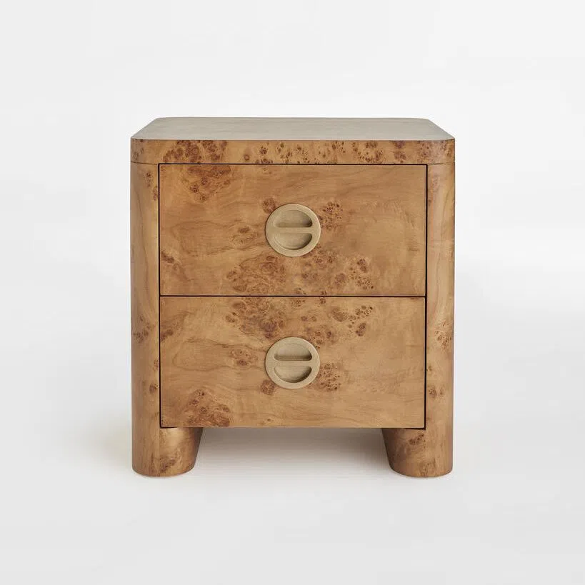 Комод из натурального дерева с отделкой шпоном сразу привлекает внимание гармонией современных форм и уникальной текстурой. Аккуратные округлые углы смягчают строгий облик, делая силуэт плавным и современной эстетики. Природный рисунок шпона создает интересный графический акцент на фасаде, подчеркивая индивидуальность изделия.