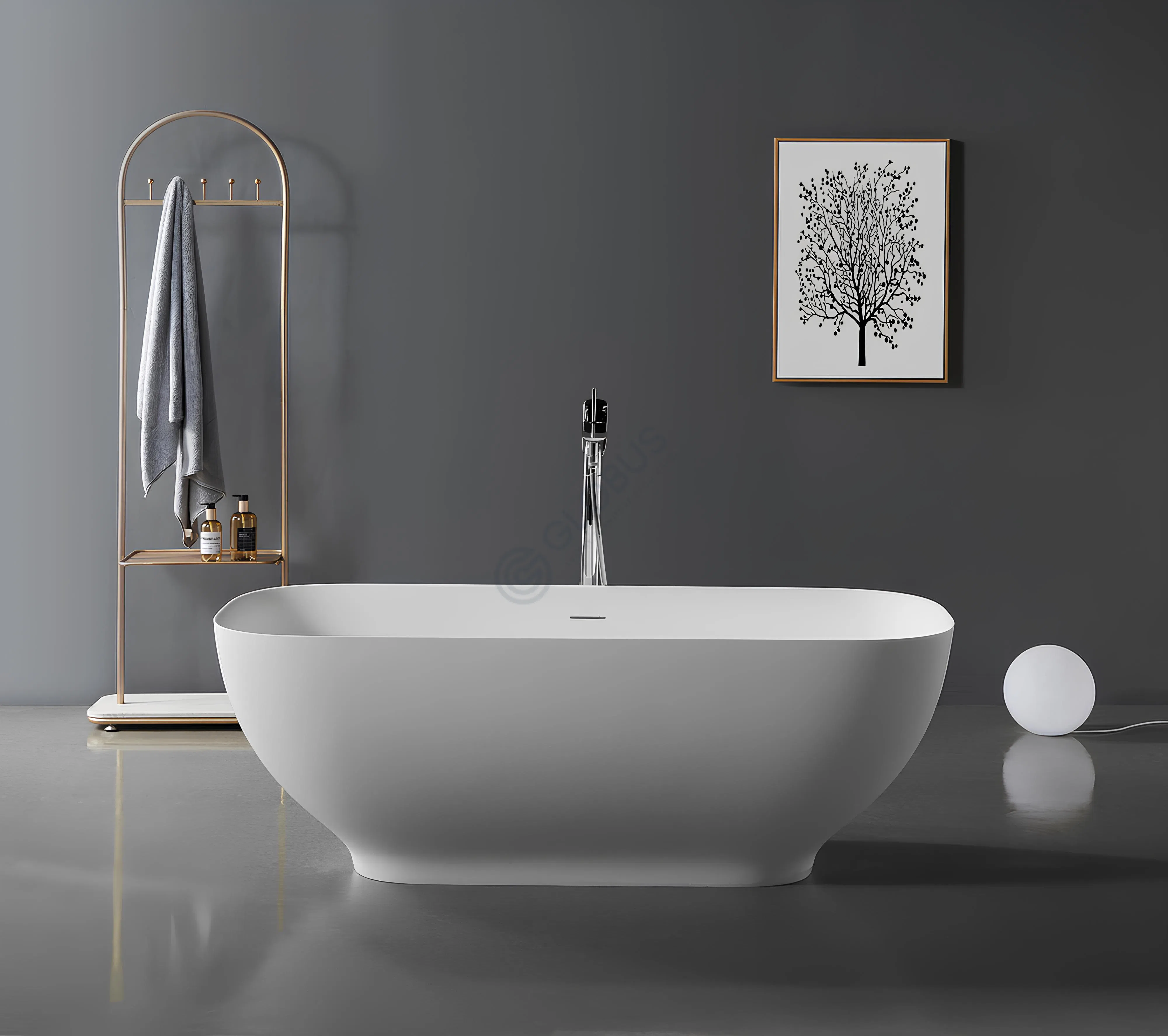 Ванна из искусственного камня сочетает в себе современную эстетику и функциональность. Внешняя поверхность с глубоким черным цветом и утонченными текстурированными прожилками напоминает природный мрамор, создавая эффект сдержанной элегантности. Материал обеспечивает идеальную гладкость и приятную на ощупь поверхность, добавляя элемент тактильного комфорта.