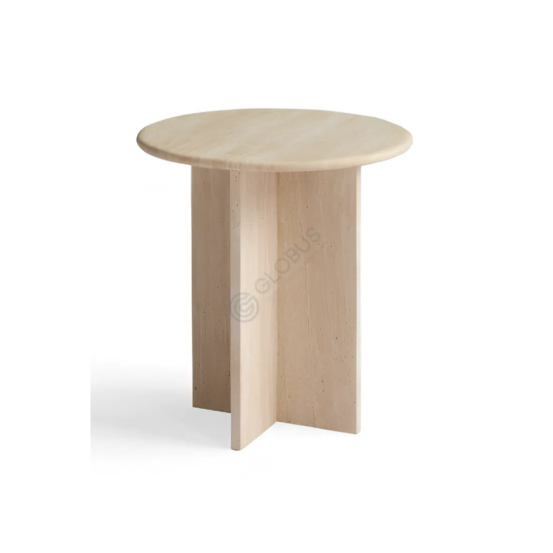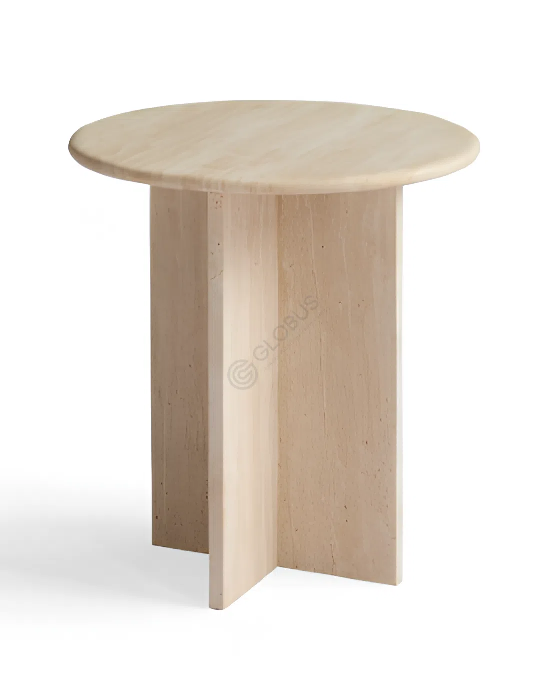 Круглая столешница имеет гладкую поверхность, подчёркивающую текстурные нюансы травертина, благодаря чему каждый элемент мебели становится уникальным. Прямая, пересекающаяся основа отличается устойчивой конструкцией и лаконичностью форм, придавая модели легкость и монументальность одновременно.