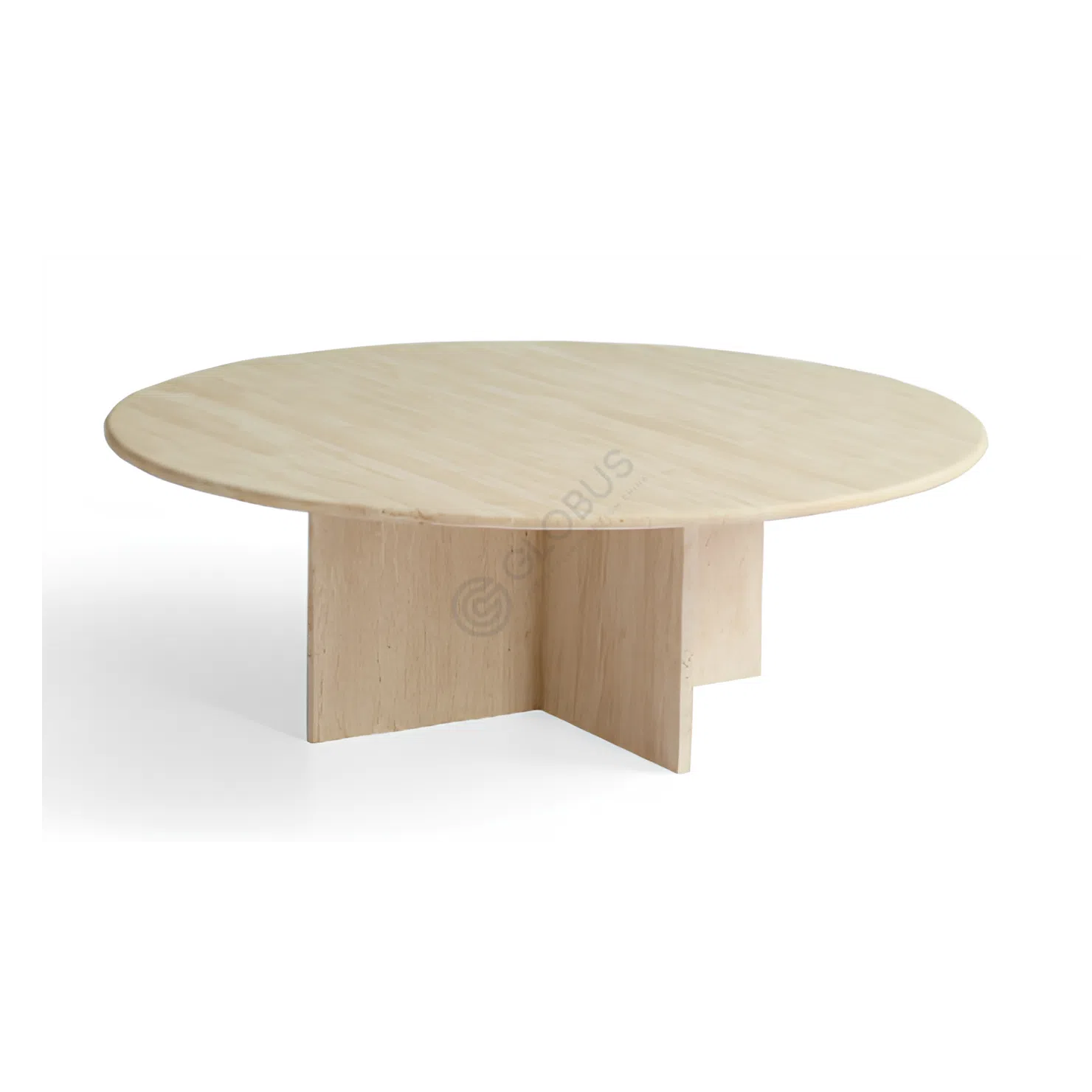 Мягкие округлые линии столешницы контрастируют с чёткими пересечениями массивного основания, создавая сбалансированную композицию. Лаконичный дизайн позволяет столу легко вписаться в любой интерьер современной гостиной, подчёркивая её изысканный стиль.