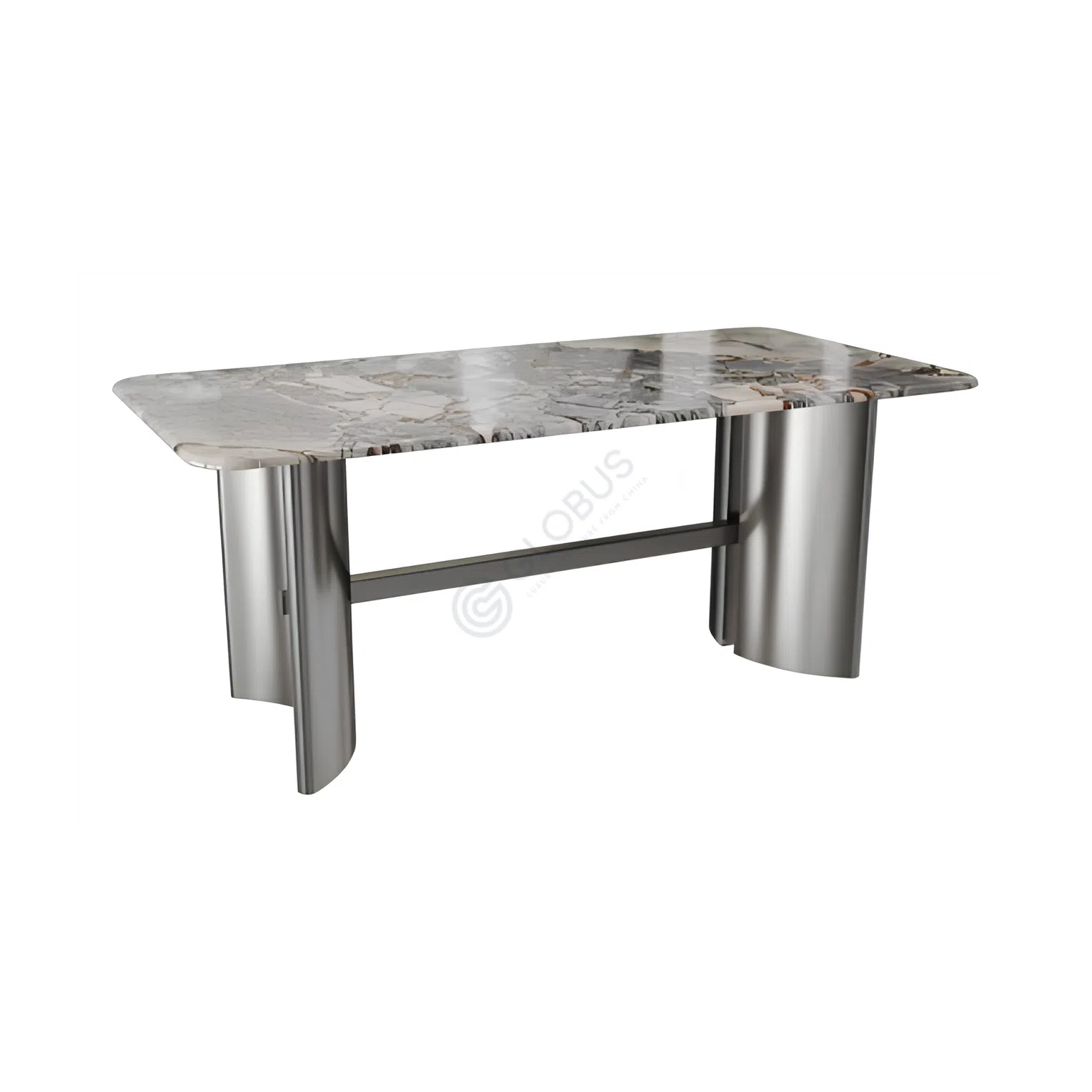 Основание выполнено из металла, что придаёт конструкции устойчивость и визуальную лёгкость. Внимание к деталям проявляется в контрасте глянцевых и матовых поверхностей, подчеркивающем геометрию силуэта.