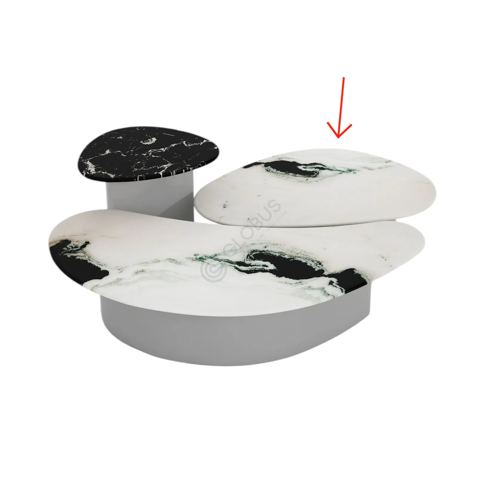 Угловой столик выполнен в элегантном современном стиле, который сочетает в себе утонченность линий и функциональность. На его поверхностях из натурального мрамора расположен выразительный рисунок, создающий эффект утонченной динамики. Гладкий блеск материала подчеркивает уникальность текстуры камня, привнося в интерьер нотки природной гармонии.