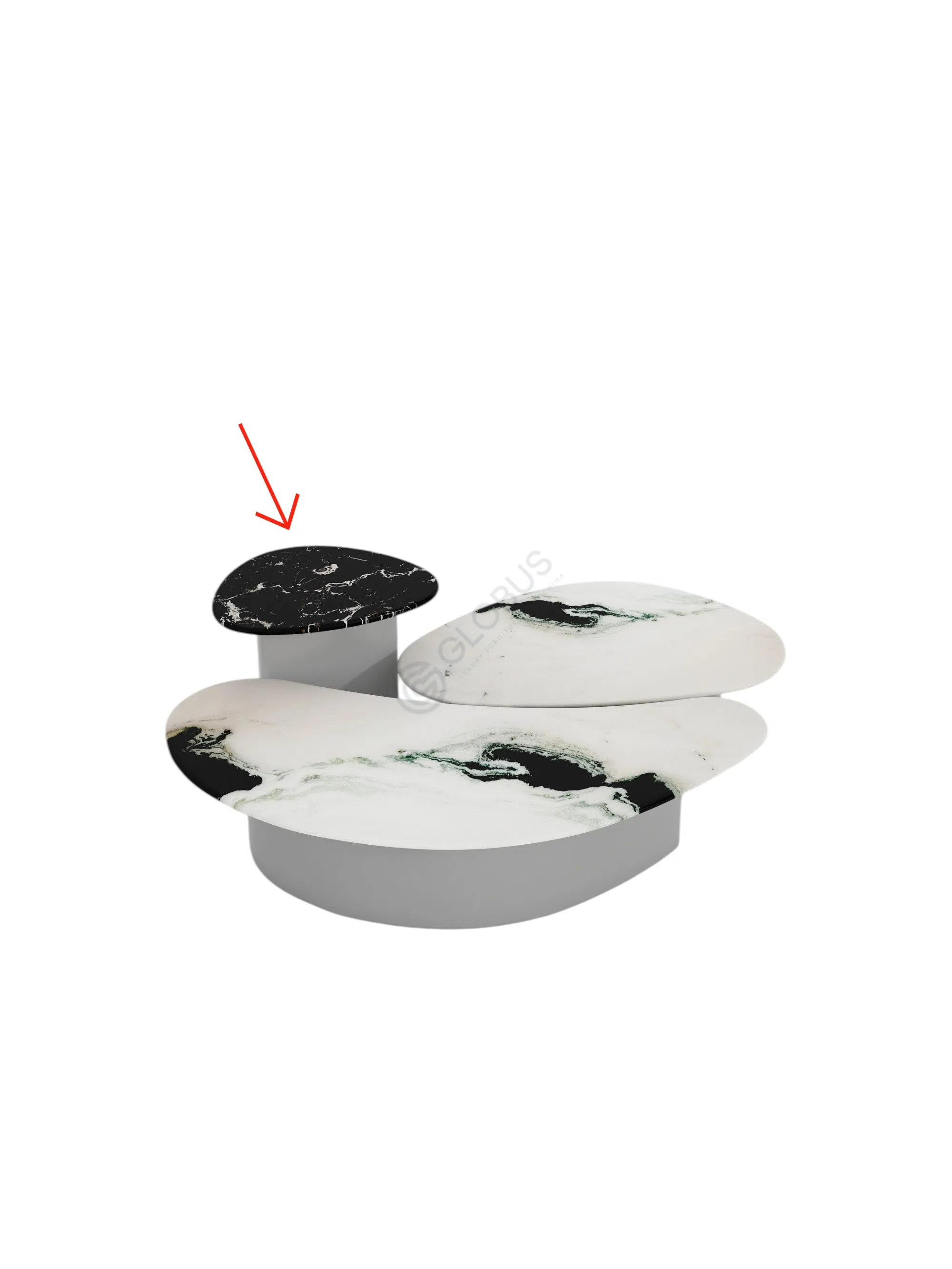 Сложная многослойная композиция столешниц разных форм и оттенков подчеркивает динамичность и изящество изделия. Контраст между светлым и темным мрамором превращает столик в выразительный элемент интерьера, способный вписаться в любой современный стиль.