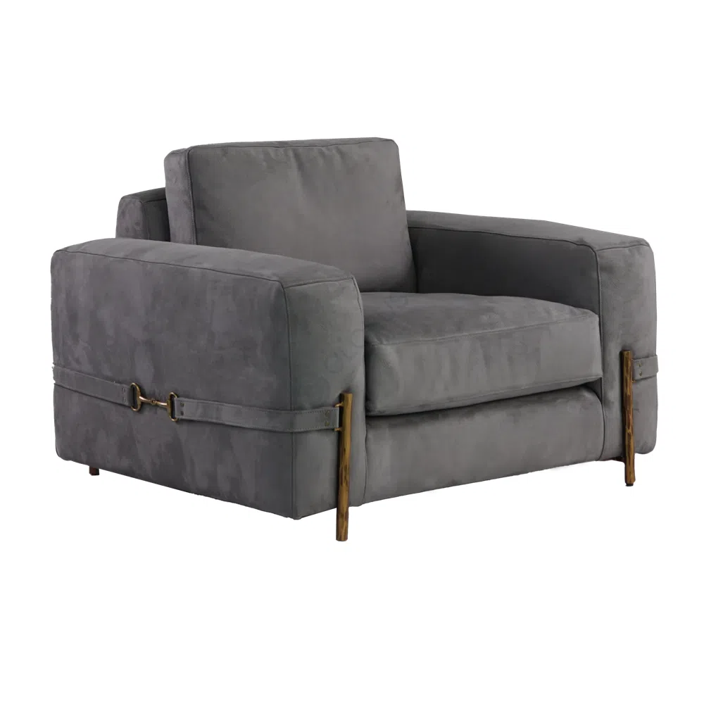 Современный диван в стиле лофт подчеркивает эстетику городской гостиная благодаря строгим формам и лаконичному дизайну. Глубокий серый оттенок экозамши создает ощущение уюта и визуального спокойствия, подчеркивая актуальность и статус интерьера.