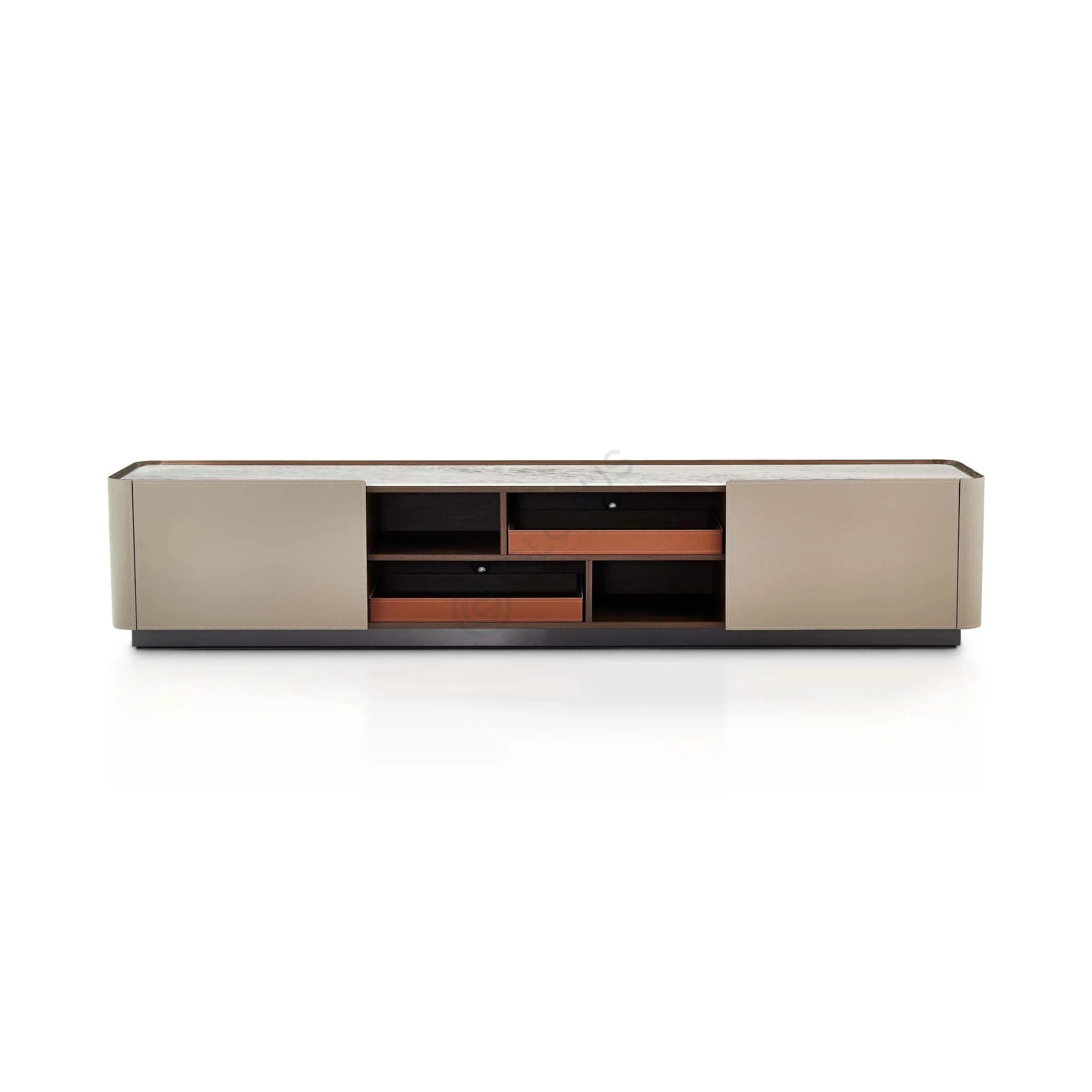 Поверхность столешницы создана из натурального камня, чьи уникальные прожилки и неповторимая текстура формируют ощущение прохладной роскоши и индивидуальности. Боковые элементы и детали внутренней отделки обтянуты высококачественной эко шорно-седельной кожей. Её деликатная фактура и теплый оттенок привносят в изделие тактильное удовольствие и визуальную гармонию, формируя изысканный контраст с холодным блеском камня. Прочная основа из МДФ обеспечивает безупречную геометрию и долговечность конструкции.
