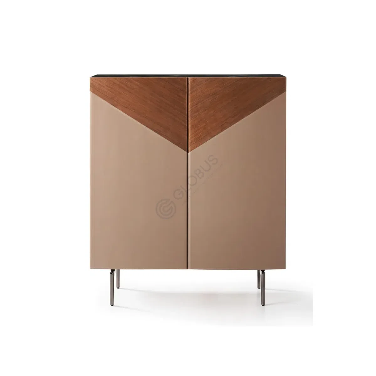 Современный буфет с чистой геометрией и графичными линиями, в котором теплая палитра бежа и дерева подчеркивает изящество силуэта. Скошенные вставки из шпона формируют выразительный рисунок на фасадах, а тонкие опоры из нержавеющей стали придают конструкции легкость и визуальную невесомость.