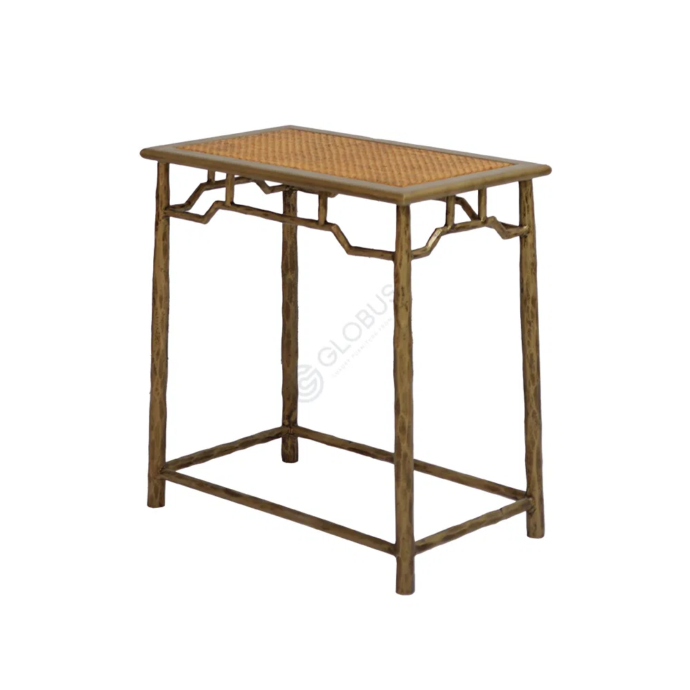 Основа конструкции выполнена из железа, придавая изделию выразительный и долговечный силуэт. Металлический каркас, обработанный для достижения благородного, слегка состаренного вида, элегантно переплетается с сиденьем. Оно искусно сплетено из ротанга, что обеспечивает не только комфорт, но и добавляет воздушность и природную текстуру. Завершающим штрихом служат деликатные обертки из кожи на подлокотниках, которые дарят приятные тактильные ощущения и подчеркивают высокий класс модели.