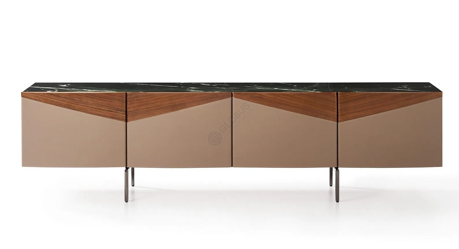 Фасад украшен треугольным акцентом из шпона, оттенённым гладкой обивкой из эко шорно-седельной кожи. Такой приём добавляет объёму визуальной выразительности и подчёркивает внимание к деталям.