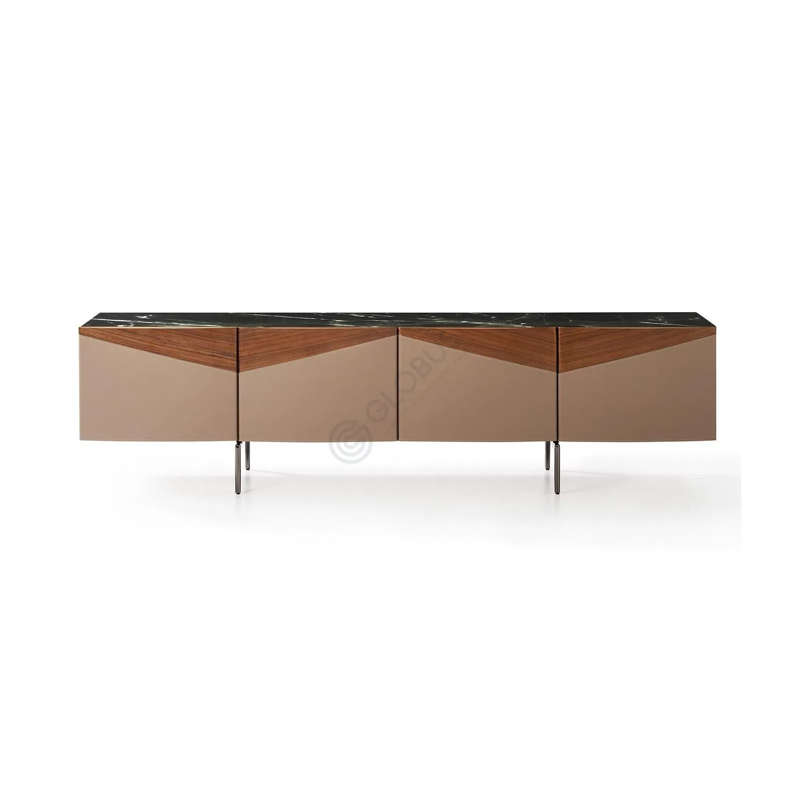 Буфет сочетает в себе строгую геометрию и натуральные фактуры, подчёркивая современный характер интерьера. Мраморная столешница плавно переходит в металлическое основание из нержавеющей стали, создавая ощущение лёгкости и надёжности одновременно.