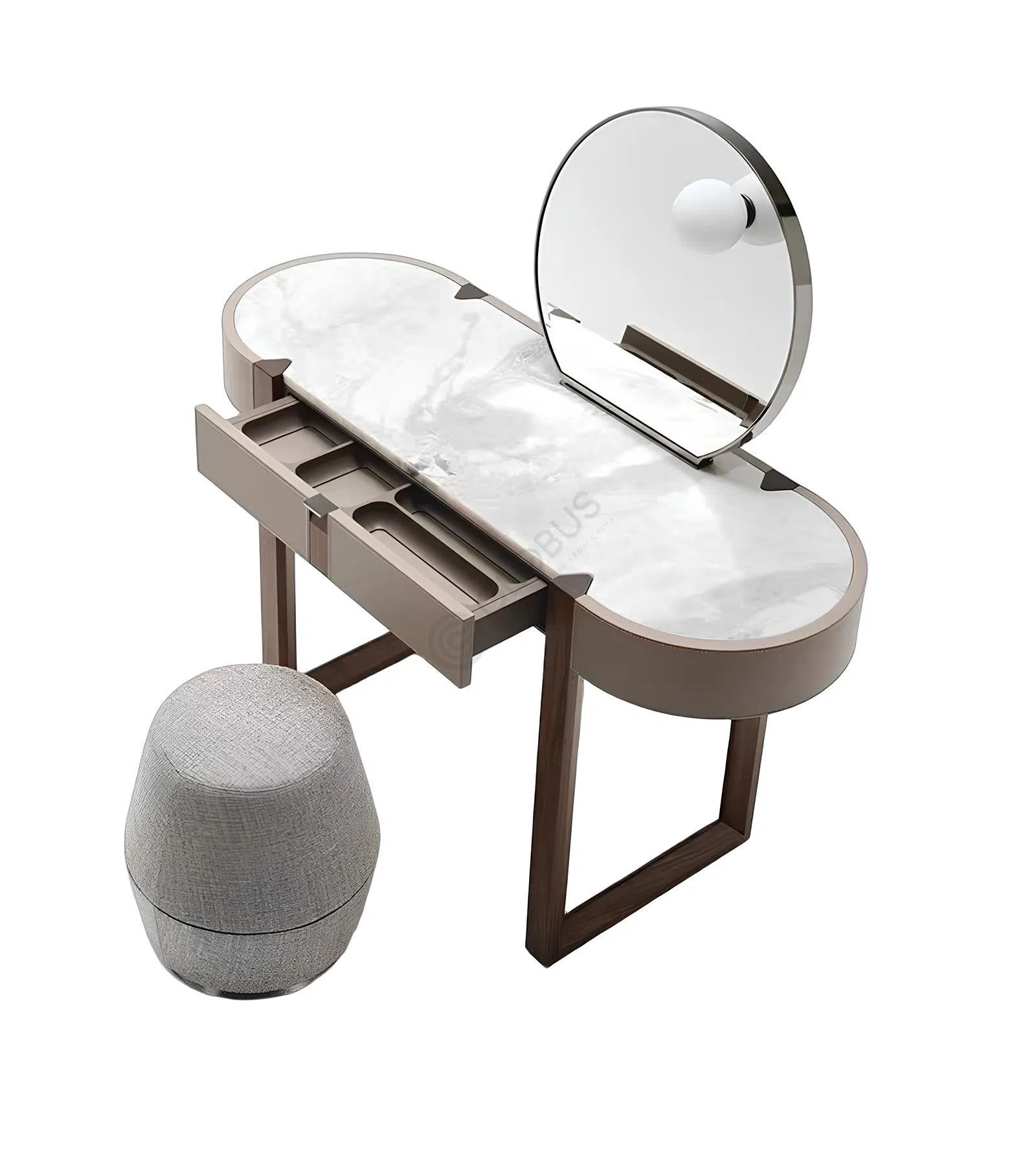Столешница из натурального мрамора раскрывает уникальный рисунок камня и выдерживает повседневную нагрузку. Корпус из массива дерева дополнен вставками из нержавеющей стали, которые подчеркивают четкость геометрии. Обрамление из эко шорно-седельной кожи создает ощущение ощутимой тактильности и служит изысканным контрастом холодному блеску металла.