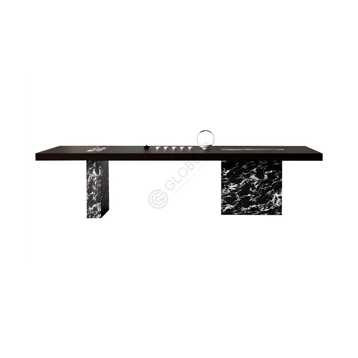 Буфет сочетает лаконичный силуэт с выразительной фактурой натурального мрамора, гармонично дополняя строгий чёрный корпус. Контраст между полированным камнем и матовым шпоном придаёт изделию актуальный современный характер.