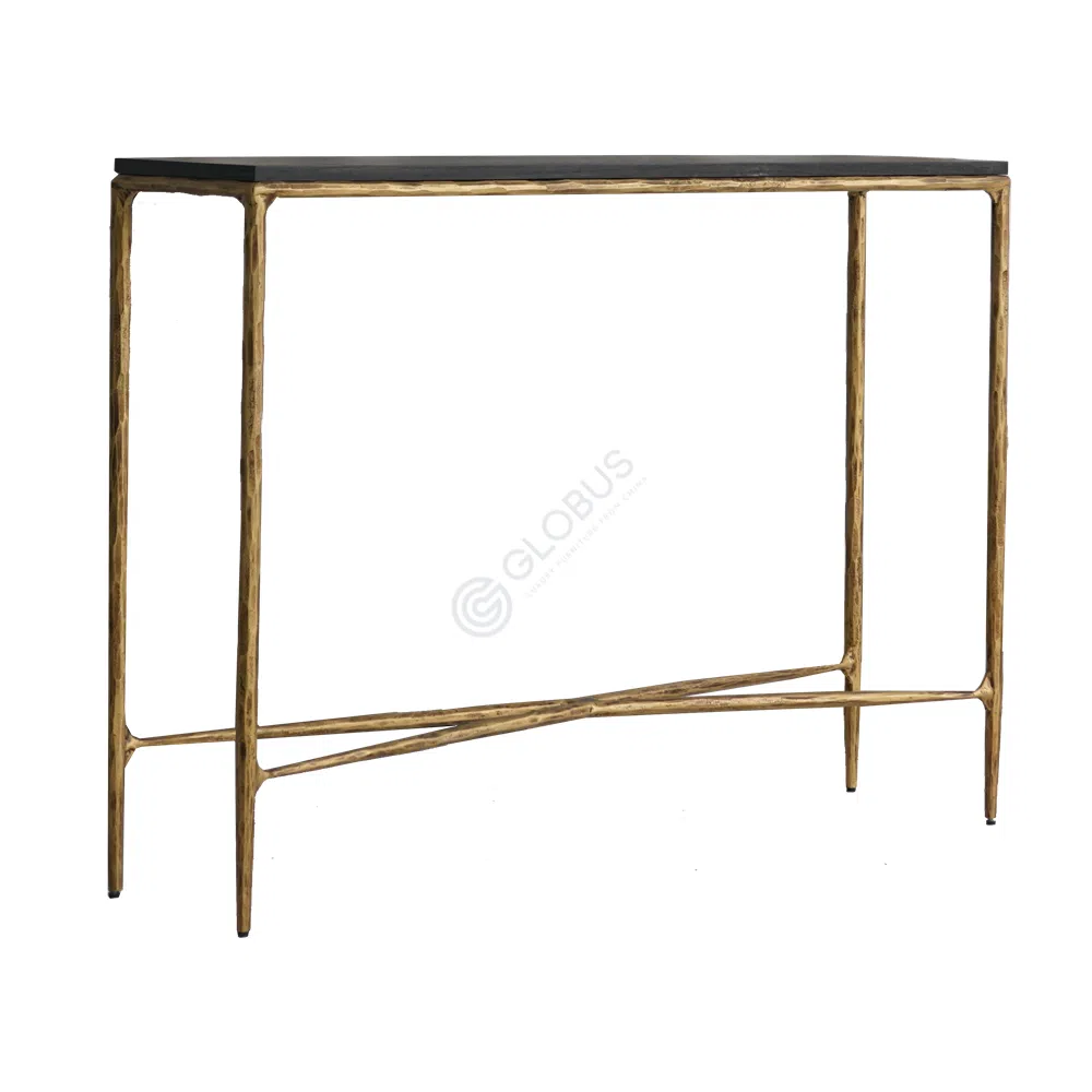 Столешница, выполненная из высококачественной фанеры, покрыта благородным шпоном темного оттенка, что придает ей глубину и неповторимый рисунок древесины. Опорой служит прочное металлическое основание из железа, отличающееся уникальной, словно выкованной вручную, поверхностью. Эта особенность придает изделию особое очарование и тактильное богатство.