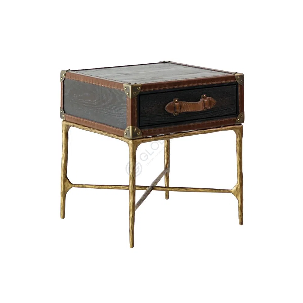 Боковые грани и столешница украшены широкой полосой из натуральной кожи, зафиксированной элегантными металлическими заклепками, что придает модели шарм винтажного сундука. Два вместительных выдвижных ящика, оснащенные изящными кожаными ремешками-ручками, предлагают удобное место для хранения мелочей, сохраняя безупречный порядок в пространстве.